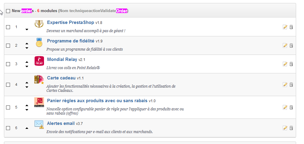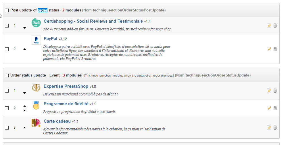 hurray Posted May 14, 2019 Author Share Posted May 14, 2019 Bonjour Mediacom87, Merci pour votre conseil. Sur "Payment confirmation" hook, il n'y a aucun module. Par contre, sur "New orders" modules, il y a 7 modules. Voici la liste: Expertise Prestashop v1.8 Programme de fidelite v1.9 Mondial Relay v2.1 Carte cadeau v1.1 Pixel Plus: Suivi de Conversion Facebook v1.8 Panier règles aux produis avec ou sans rabais v1.0 Alertes émail v3.7 Comment savoir lequel ou lesquels pose(nt) problème? Merci. Link to comment Share on other sites More sharing options...