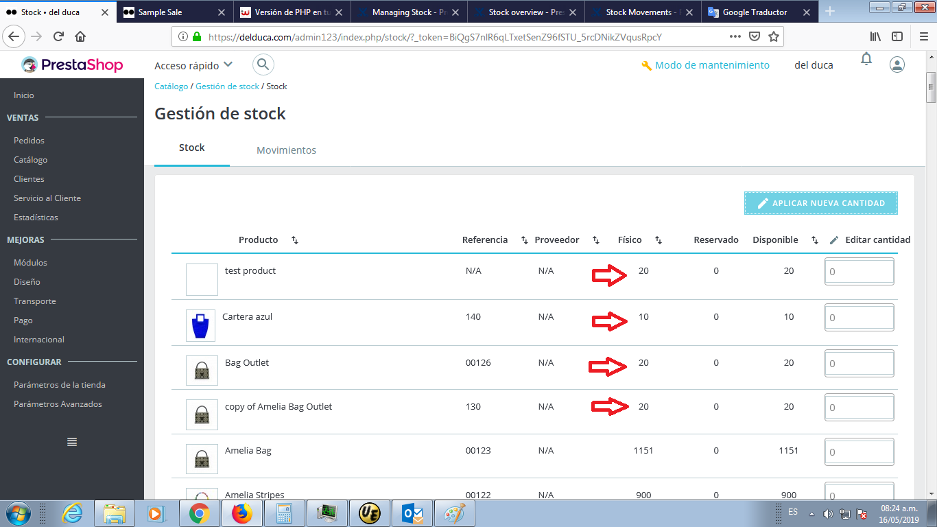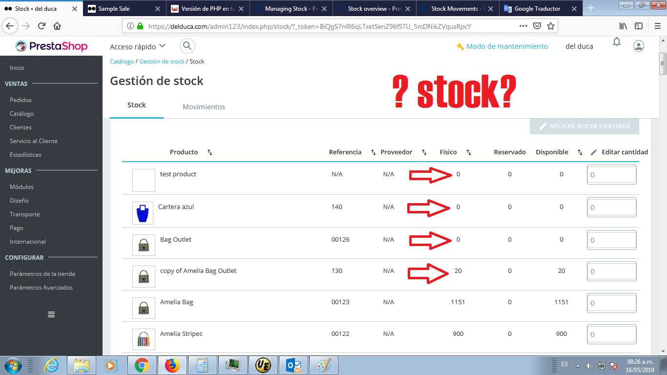 Sebastian04 Posted May 20, 2019 Author Share Posted May 20, 2019 1 hour ago, gusman126 said: Parece que esas pantallas son de gestion avanzada de stock , Tienes varios almacenes? Si no tienes varios almacenes lo mejor sera que deshabilites la opcion de gestion avanzada de stock, que pensaba que en la 1.7 lo habian quitado. Que version tienes? Mi Versión de PrestaShop: 1.7.2.4 Solo Tengo un almacen, el que viene por defecto. Si utilizo los productos que vienen cargados no tengo problemas con el stock. Solo ocurre con los nuevos. En un Foro hablan de agregar una columna(location) a la tabla de Stock, eso es así? adjunto pantallas Link to comment Share on other sites More sharing options...