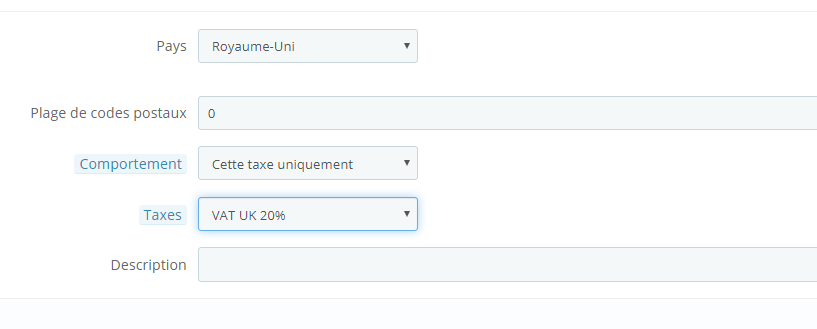 doekia Posted May 21, 2019 Share Posted May 21, 2019 Voilà, dans la règle de taxe FR Taux Standard 20% tu dois définir la taxe pour les pays. Tout pays absent, hérite de la taxe à 0 Link to comment Share on other sites More sharing options...