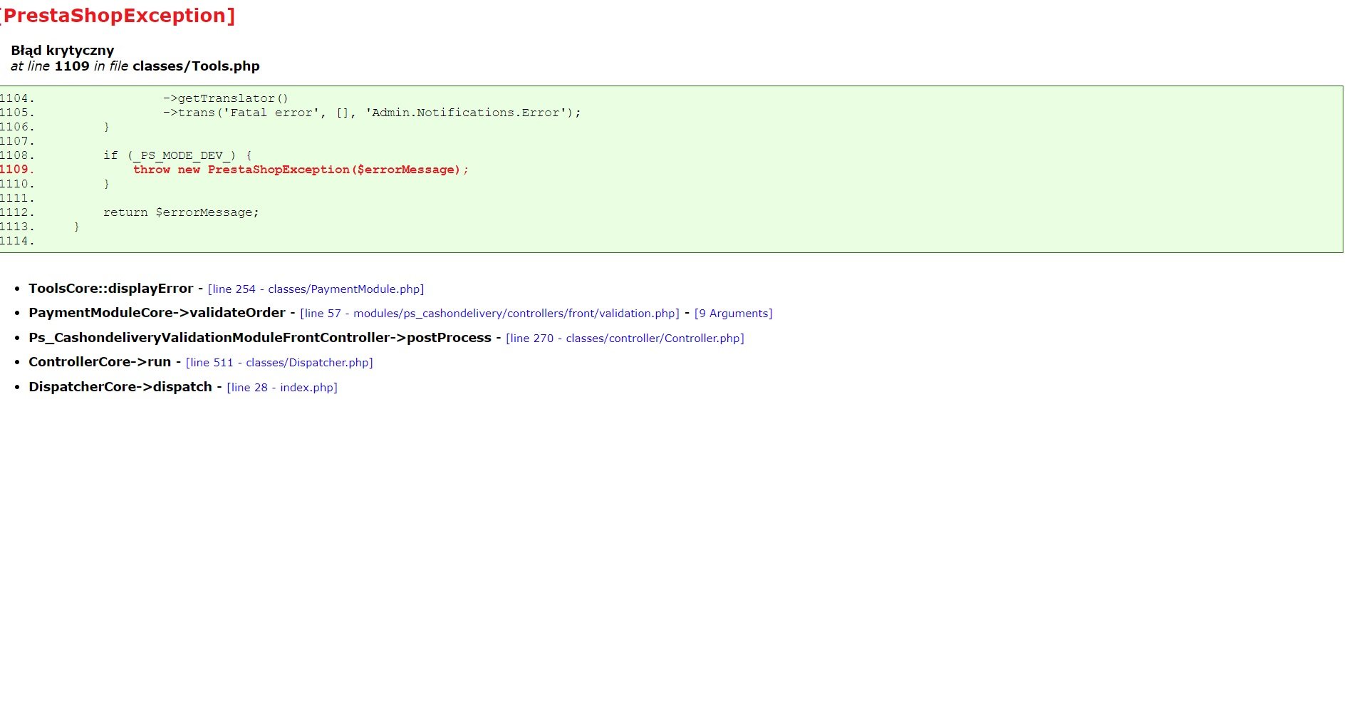 webbay.pl Posted May 21, 2019 Share Posted May 21, 2019 (edited) Witam, Mam problem ze złożeniem zamówienia bez względu na wybór metody płatności powstaje ten sam problem. W trybie "Mode Debug" otrzymują błąd krytyczny. Sprawdzałem w necie i nie znalazłem rozwiązania, być może ktoś będzie w stanie pomóc. Kod błędu: [PrestaShopException] Błąd krytycznyat line 1109 in file classes/Tools.php 1104. ->getTranslator() 1105. ->trans('Fatal error', [], 'Admin.Notifications.Error'); 1106. } 1107. 1108. if (_PS_MODE_DEV_) { 1109. throw new PrestaShopException($errorMessage); 1110. } 1111. 1112. return $errorMessage; 1113. } 1114. ToolsCore::displayError - [line 254 - classes/PaymentModule.php] PaymentModuleCore->validateOrder - [line 57 - modules/ps_cashondelivery/controllers/front/validation.php] - [9 Arguments] Ps_CashondeliveryValidationModuleFrontController->postProcess - [line 270 - classes/controller/Controller.php] ControllerCore->run - [line 511 - classes/Dispatcher.php] DispatcherCore->dispatch - [line 28 - index.php] Edited May 21, 2019 by webbay.pl (see edit history) Link to comment Share on other sites More sharing options...