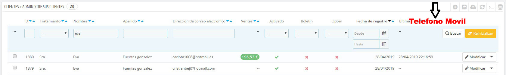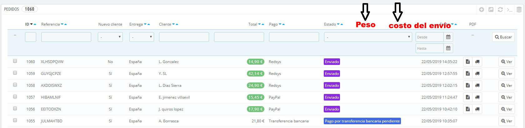 Chuchelandia Posted May 22, 2019 Share Posted May 22, 2019 Buenas a todos, quiero hacer un par de cambios en mi backoffice de Prestashop. Tengo la versión 1.6.11 y quiero hacer un par de cambios en dos sitios, la pantalla de "lista de pedidos" y la "lista de clientes". En el primero, "lista de pedidos" me gustaría que añadir en esa pantalla 2 columnas más, una con el PESO DEL PEDIDO y otra con EL COSTO DEL ENVIO, ya que me facilitarían mucho a la hora de ver gráficamente y saber qué se ha gastado el cliente en la tienda, cuanto es de portes y cuánto pesa el pedido. En el segundo, "lista de clientes" me gustaría añadir en esa pantalle la columna de Telefono Movil, y poder exportar en excel un listado de clientes donde me aparecieran los moviles para facilitarme su registro en un programa interno que tengo. Os adjunto 2 pantallazos de lo que pretendo para que lo veais más claramente, Gracias!!!!! :) Link to comment Share on other sites More sharing options...