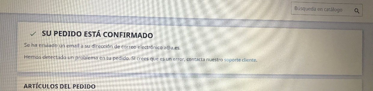 ccm Posted May 23, 2019 Share Posted May 23, 2019 Buenos días, trabajamos con la versión de prestashop 1.7.5.1. Nos sucede que tenemos una serie de errores en la pantalla de confirmación de pedido y no somos capaz de darles solución, por si alguien nos puede ayudar. 1.- Nos pasa, que sea cual sea la respuesta del TPV, siempre nos muestra el mensaje de "Su pedido está confirmado", y claro si hay algun error en el TPV y al continuar te muestra este mensaje ... puede llevar a confusión. Se podría personalizar este mensaje para que según si el pago ha ido bien o no muestre un mensaje u otro?? Cómo y donde? 2.- En esa misma pantalla de confirmación de pedido, si ha habido un fallo en el tpv, despues del mensaje anterior, te muestra la frase: "Hemos detectado un problema en tu pedido. Si crees que es un error , contacta nuestro 'soporte cliente'", siendo estas ultimas dos palabras un enlace que no lleva a ningún sitio, como podemos quitar el enlace ? Nos vale con dirigirles de palabra a nuestro formulario de contacto. Muchas gracias de antemano. Link to comment Share on other sites More sharing options...