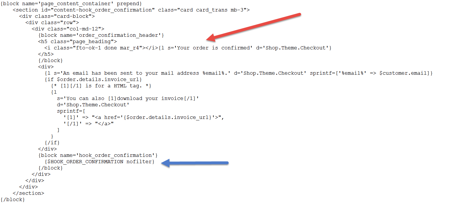 gusman126 Posted May 24, 2019 Share Posted May 24, 2019 De redsys, pues no lo había visto nunca o ningun cliente me ha indicado que sale ese aviso. Viendo el fichero de confirmación de la plantilla que conozco y suelo usar (captura de pantalla 1), veo que el texto de "su pedido esta confirmado" es fijo no se puede cambiar dependiendo del tipo de pago, transporte o de otra informacion del pedido (flecha roja), Lo que pides de cambiar ese texto dependiendo de algún dato del pedido, vas a tener que modificar este fichero con un if o añadiendo un tpl completo algo asi : {include file='catalog/_partials/fichero_con_info_extra.tpl'} Aunque nunca he tocado este apartado y no tengo ni idea de como puedes hacerlo. mira si en el foro ingles hay algo Luego como ves en la flecha azul, el texto y enlace del error si que lo envia el modulo de Redsys usando el hook de order_confirmation Link to comment Share on other sites More sharing options...