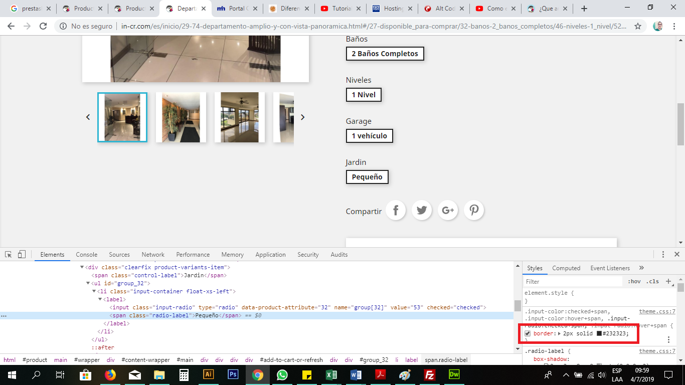 UniArt Posted July 10, 2019 Share Posted July 10, 2019 On 7/5/2019 at 6:05 AM, darkocr said: Quiero quitarles el borde a las características y también cambiar el color de la letra, pero aunque en el código en dreamweaver ya esta cambiado en la pagina sigue igual. Puede ser que tengas un problema con la cache (no uso dreamweaver, pero hay que limpiar cache del explorador a menudo, y en el backoffice hay que tener las opción de Compilación de plantillas en "forzar" y limpiar cache si se modifica algo etc...( el chrome y sus descendiente no actualizan la pagina por completo ni con f5, hay que limpiar a fondo para ver las modificaciones) Puede ser que haya un otro archivo css que haga overhide en la regla css, por ejemplo algún módulo o el propio custom.css, que en mi opinión es lo deberías utilizar para modificar el css del tema. Improbable pero... Puede ser que tal border se añade y se quita con js, cuando se selecciona la opción y/o tiene el hover activado. Link to comment Share on other sites More sharing options...