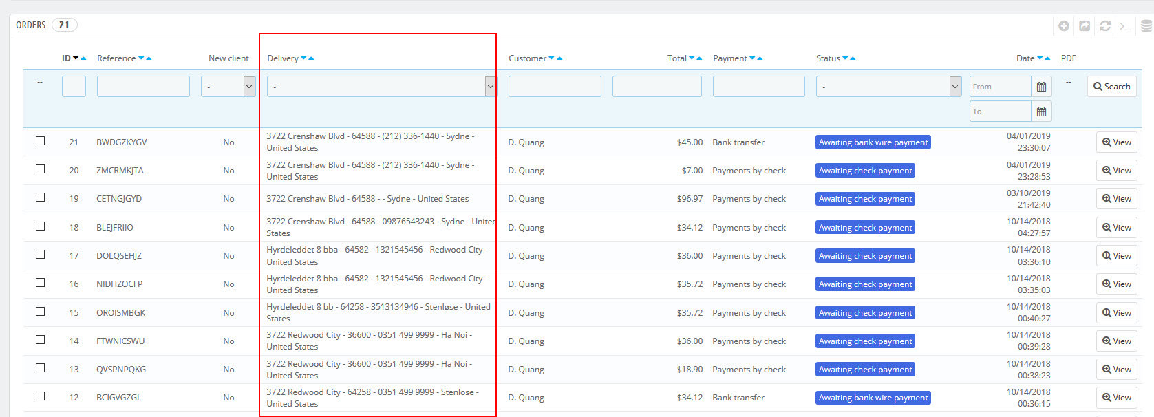 prestamonste Posted June 11, 2019 Share Posted June 11, 2019 Hi, In your case, you need to custom the query sql. Please open file: public_html/controllers/admin/AdminOrdersController.php Go to line code: 58 Change it from: country_lang.name as cname, To: CONCAT(address.`address1`, \' - \', address.`postcode`, \' - \', address.`phone`, \' - \', address.`city`, \' - \', country_lang.name) AS `cname`, This is my result testing: 1 Link to comment Share on other sites More sharing options...