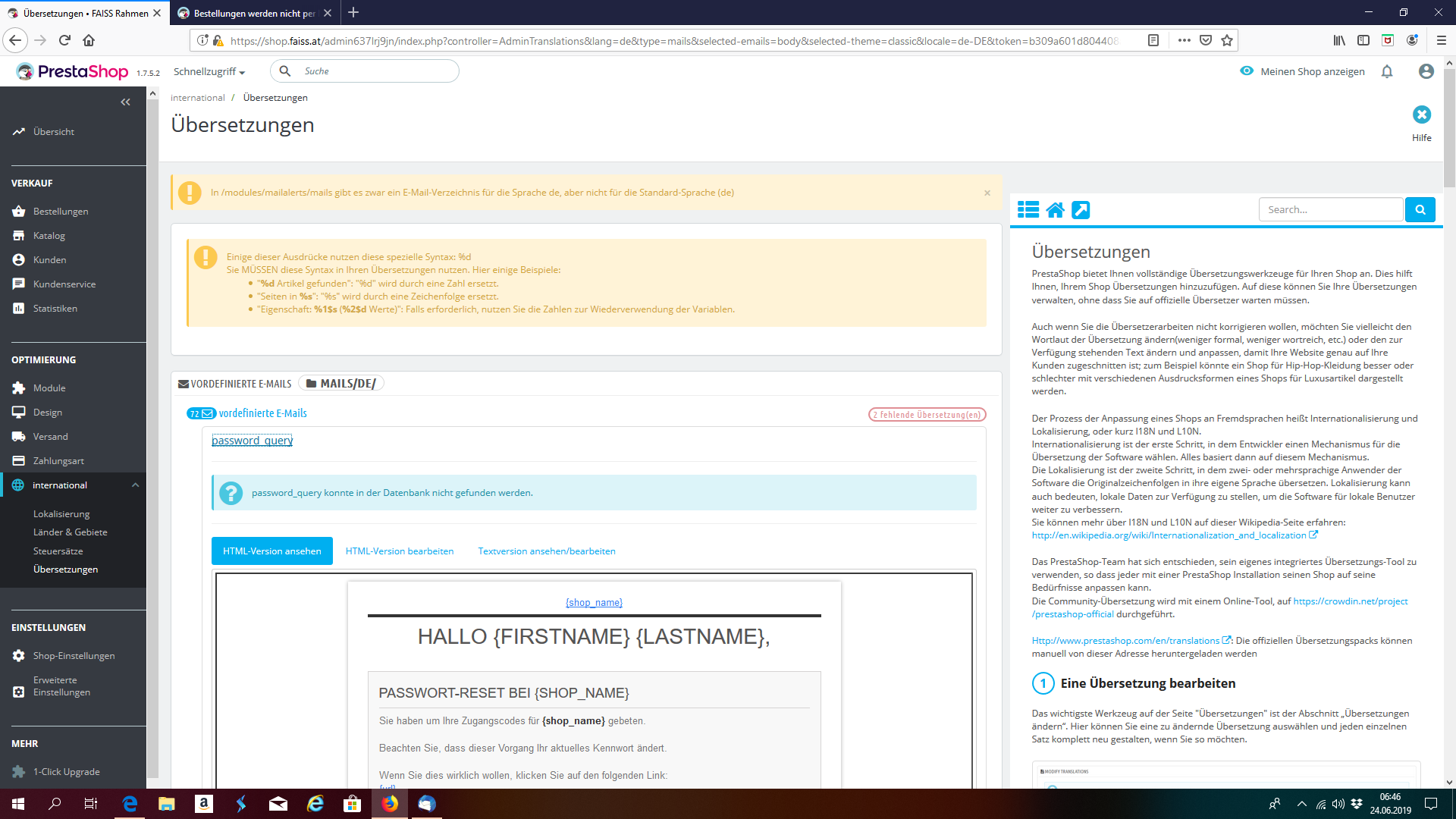 pawag Posted June 20, 2019 Author Share Posted June 20, 2019 So jetzt nochmal was gefunden: Hab bei den Übersetzungen was gefunden und jetzt fehlen hier 2 Übersetzungen. order_conf_cart_rules und die order_conf_product_list Kann mir bitte hier jemand die Übersetzung aus seinem Prestashop rauskopieren und hier übermitteln? Weiters erscheint bei den Übersetzungen nun folgende Meldung: In /modules/mailalerts/mails gibt es zwar ein E-Mail-Verzeichnis für die Sprache de, aber nicht für die Standard-Sprache (de) Was muss ich hier ändern, dass die Sprache de die Standard Sprache wird?? Link to comment Share on other sites More sharing options...