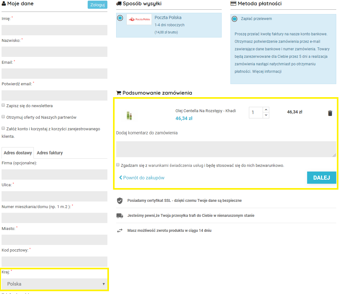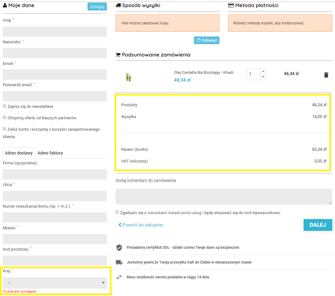Mianowicie przy składaniu zamówienia (wypełnienie danych itp) jeżeli nie wybierze się jeszcze kraju wysyłki ( jest tylko dostępna Polska) to jak widać na załączonym obrazku nr.2 dolicza oraz wyświetla wysyłkę ale jeżeli wybiorę już ten kraj, wysyłka znika i już nie nalicza do zamówienia. Taka sama sytuacja jest z rabatami.