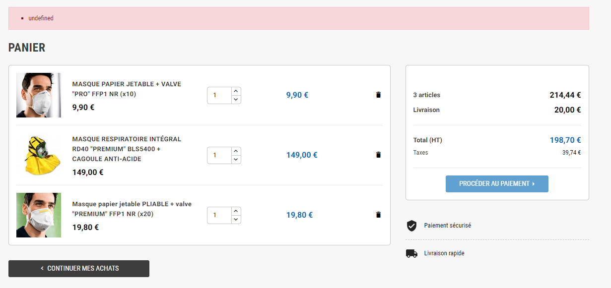 FannyAdexo Posted June 12, 2019 Share Posted June 12, 2019 Bonjour à tous, J'ai 3 problèmes sur la boutique que je suis en train de creer : Probleme suppression produit panier : lorsque je supprime un produit du panier, j'ai un champ rouge en UNDEFINED et cela desactive le bouton PROCEDER AU PAIEMENT. Il faut recharger la page pour que cela refonctionne correctement. Problème de traduction : j'avais précédemment personnalisé sans problème les traductions via International / Traduction, il ne prend plus en copte mes modifications. Il valide bien mais le champ reste sélectionner en rouge et je n'ai aucun changement nulle part Merci beaucoup pour votre aide. Voici ma config : Type d’install (nouvelle/MàJ) : Nouveau site Version de PS : 1.7.1.2 URL du site concerné : https://sldistribution.fr Thème (défaut/perso) : ZOne Theme Hébergement : OVH Version de PHP : 7.0 Version de MySQL : MYSQL v.5.6 Navigateur(s) concerné(s) : Chrome et autre Bonne journée ! Link to comment Share on other sites More sharing options...