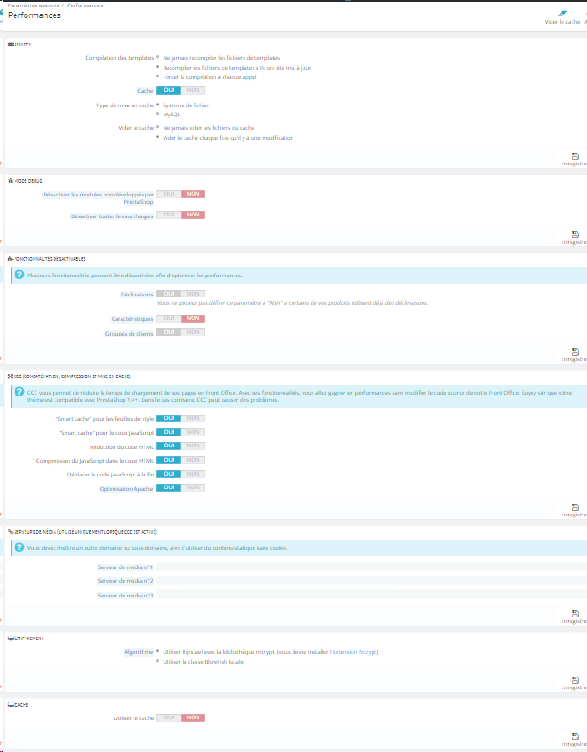 [email protected] Posted June 12, 2019 Share Posted June 12, 2019 Bonjour, Concernant les paramètres de performance : - Est-il mieux d'activer le cache smarty ? - Concernant les fonctionnalités désactivables comme déclinaison, caractéristique, groupe de client. Faut-il les activer ou non ? - Faut-il mettre oui ou non à utiliser le cache ? Merci beaucoup Link to comment Share on other sites More sharing options...
