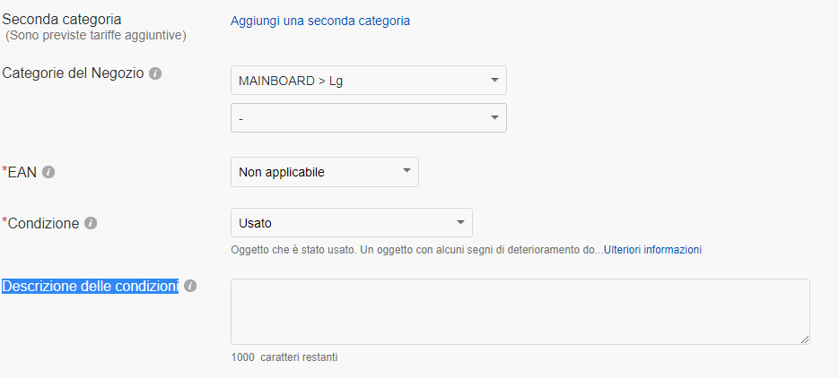 Antonio FaqEcommerce Posted June 23, 2019 Share Posted June 23, 2019 Ciao a parte che non so che versione hai di fastbay, tuttavia nella scheda del prodotto hai il campo "Testo aggiuntivo prima della descrizione", ma secondo me puoi mettere la descrizione delle condizioni direttamente nella descrizione. Le condizioni su ebay sono predefinite, quello che tu metti in quel campo viene indicato nella descrizione. Link to comment Share on other sites More sharing options...