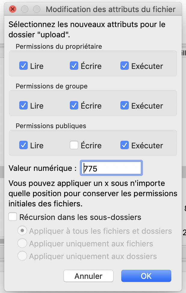 Wstdhz Posted June 13, 2019 Author Share Posted June 13, 2019 Si FileZilla m'annonce ça quand je consulte les droits d'accès aux fichiers, ce sont bien les droits actuellement configurés? Link to comment Share on other sites More sharing options...