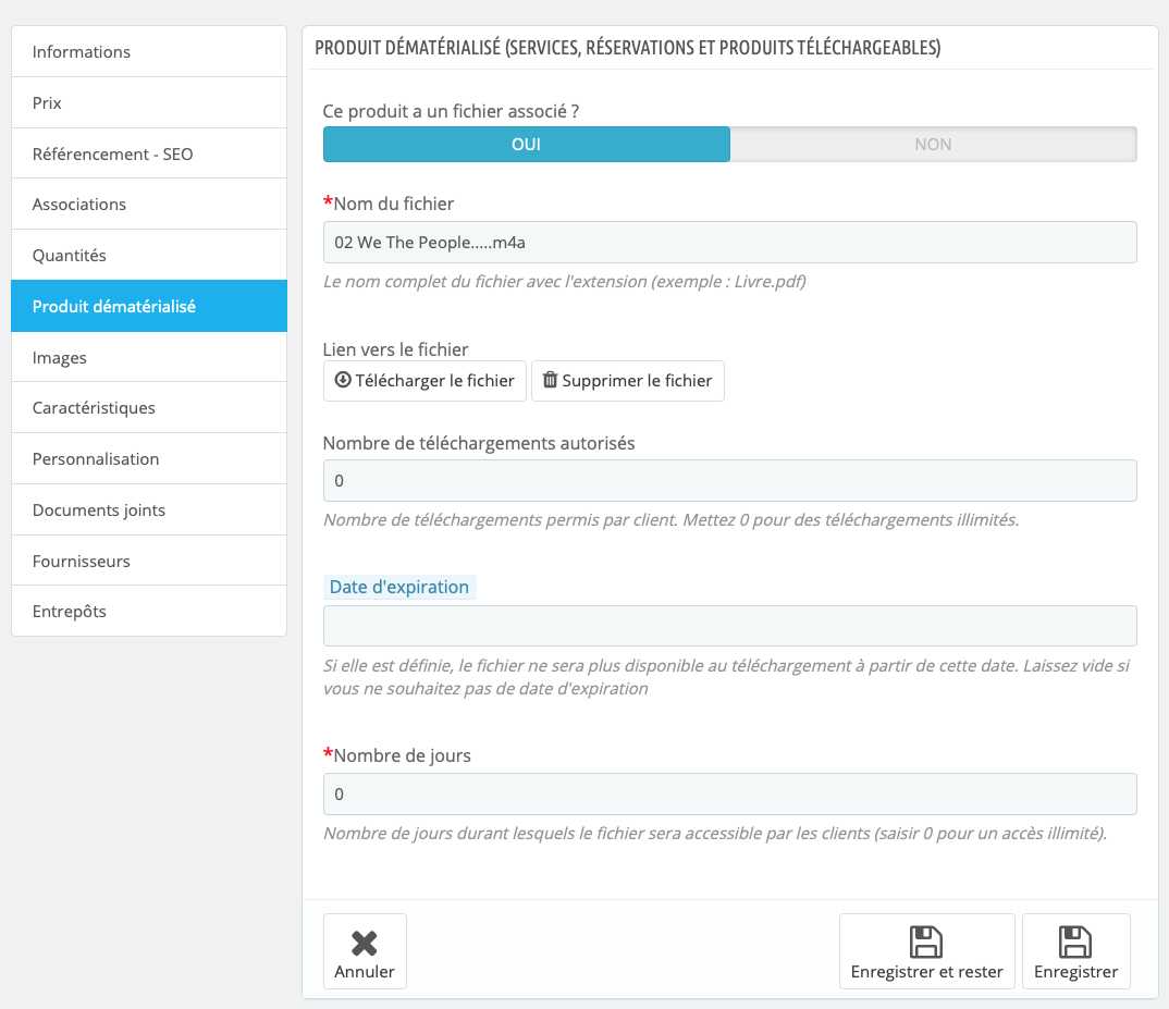 wokl Posted June 14, 2019 Share Posted June 14, 2019 Bonjour, Nous voudrions mettre a disposition gratuitement un fichier MP3 d'un livre audio jeunesse. (MP3 de 53,9 Mo) (Prestashop 1.6.1.12 - hébergé chez o2switch) Les réglages PHP chez l'hébergeur ont été mis à jour pour permettre les téléchargements de fichier volumineux, ainsi que les préférences de Prestashop. Sur le back-office, quand j'édite la fiche produit, dans la rubrique "Produit dématérialisé," le champ « Ce produit a un fichier associé » se remet de lui même sur "Non" lors du téléchargement du MP3. Pourtant, en vérifiant sur le FTP, le fichier est bien chargé dans le dossier "download". Je l'ai récupérer depuis le FTP, remis une extension.mp3 et le fichier est fonctionnel... J'ai ensuite testé avec un m4a de 8Mo. Là le fichier se charge "normalement" et la rubrique Produit dématérialisé reste sur OUI. C'est déjà mieux, mais... Le fichier n'est accessible par sur le fronts office, même si on vas au bout de la procédure d'achat... Pour être complet, j'ai coché l'option " Informations / Produit dématérialisé (services, réservations, produits téléchargeables, etc.)" dans la rubrique Informations. L'option " Disponible à la vente". Le Prix est à 0.00. J'utilise la gestion de stock avancée (et je me demande si le problème ne vient pas de là - je ne retrouve pas ce produit dans la gestion de stock avancé...) Dans Qantités, Accepter les commande est coché. Auriez-vous une piste pour résoudre ce problème ? Link to comment Share on other sites More sharing options...