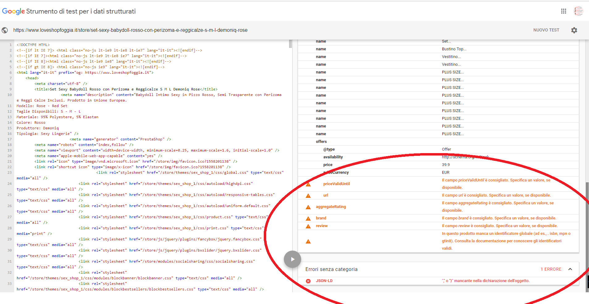 ZioCan Posted July 29, 2019 Share Posted July 29, 2019 Ciao, i dati strutturati sono presenti e rilevati da google, la parte destra non e' altro che un elenco dei dati che google rileva e i dati ci sono. Poi vengono evidenziati una serie di problemi (quelli in giallo) la cui importanza e' marginale, in pratica dice che alcuni campi sono assenti e sarebbe consigliabile metterli. L'assenza di questi dati comunque non pregiudica la validita' della pagina, la pagina e' valida e i dati in essa contenuti verranno utilizzati, anche se incomplet, anzi 'incompleti' mi pare eccessivo, diciamo che l'assenza di alcuni di questi dati e' da ritenersi 'normale'. Non cononosco il modulo che usi tu, io utilizzo la funzione integrata in Prestashop, che per inciso contiene gli stessi problemi, ma veniamo ai campi mancanti: priceValidUntil - e' una data di scadenza dell'offerta, in realta' e' possibile compilare questo campo, ma secondo me e' decisamente scomodo, per cui ho deciso di lasciarlo perdere e non credo sia rilevante. url - questo campo genera confusione perche' ce ne sono due, il primo si riferisce al prodotto ed e' compilato correttamente, il secondo che manca si riferisce all'offerta, io ho risolto modificando il template (product.tpl) utilizzando la stessa URL del prodotto. review e aggregateRating - questi valori vengono compilati solo se sono presenti delle valutazioni da parte dei clienti, se non ce ne sono non e' un problema. brand - questo campo e' inspiegabilmente assente e siccome lo ritengo abbastanza rilevante l'ho aggiunto modificando il file product.tpl (si trova nella cartella del tema che utilizzi), aggiungendo una riga come questa: {if isset($product_manufacturer->id)}<meta itemprop="brand" content="{$product_manufacturer->name}">{/if} l'ultimo campo, dove dice che manca un identificatore globale, semplicemente non lo considero, penso sia rilevante solo su articoli che hanno un codice fisso e importante che viene ricercato, come ad esempio i ricambi auto. Per quanto riguarda il messaggio di errore, ti consiglio di notificarlo all'autore del modulo, visto che in questo caso si tratta di un errore vero e proprio, non di un semplice avvertimento. Link to comment Share on other sites More sharing options...