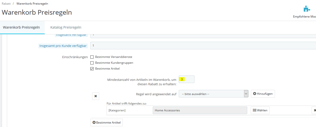 JBW Posted June 18, 2019 Share Posted June 18, 2019 In den Warenkorbpreisregeln kannst du auch auf Kategorien einschränken und eine Mindestanzahl einstellen. Hier ein Beispiel: Link to comment Share on other sites More sharing options...
