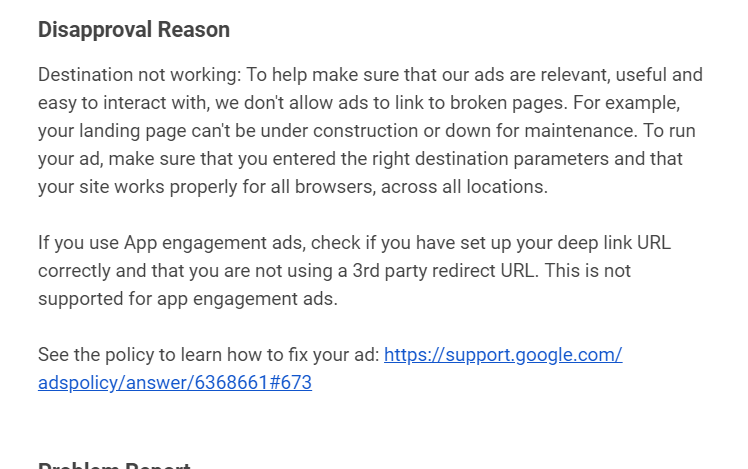 ragheb Posted June 27, 2019 Author Share Posted June 27, 2019 Je viens de corrigé. J'ai eu ce message de Google : Hello Google Advertiser, We wanted to alert you that one or more of your ads or keywords have been disapproved. Unfortunately, we won't be able to show your ads on Google, our search partners or on Display Network placements until you edit your ads or keywords to make them compliant with our policies. If this is an error, we want to get your ads back up and running as quickly as possible, and your Google team is here to help. Below you'll find the reason why your ads or keywords have been disapproved, and a Problem Report that includes details about which ads or keywords have been disapproved and what you can do to fix them (if possible). Link to comment Share on other sites More sharing options...