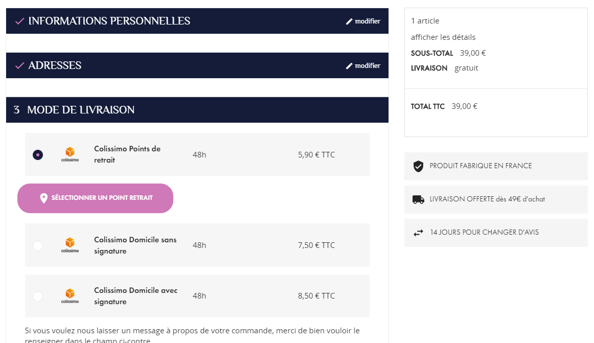 _YoZu Posted June 19, 2019 Share Posted June 19, 2019 (edited) Bonjour, je me permets d'envoyer ce message car j'ai un souci au niveau de mon panier. Je m'explique : J'ai configuré les frais de port via le module colissimo. Pour plus de simplicité concernant la configuration, je ne mets pour l'instant pas de fdp gratuits. Ainsi, les remontées du module Colissimo sont ok, mais comme vous pouvez le constater à droite, le panier indique tout le temps des fdp gratuits. Par la suite, au paiement, c'est le bon montant fdp compris qui est à payer, mais le montant affiché dans le panier est lui, erroné (fdp restent désespérément gratuits). Je précise que j'ai fait de nombreux test, avec des règles panier, qui n'ont rien changé, et que le résultat est identique avec le thème d'origine. Quelque chose doit m'échapper, mais je ne trouve pas... Merci par avance pour votre retour ! Edited June 19, 2019 by _YoZu (see edit history) Link to comment Share on other sites More sharing options...