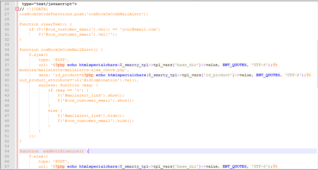 kiri84 Posted June 21, 2019 Author Share Posted June 21, 2019 Bonjour, tofrou oui bien sur, l'imprim écran pour les lignes le code : // <![CDATA[ oosHookJsCodeFunctions.push('oosHookJsCodeMailAlert'); function clearText() { if ($('#oos_customer_email').val() == '[email protected]') $('#oos_customer_email').val(''); } function oosHookJsCodeMailAlert() { $.ajax({ type: 'POST', url: '<?php echo htmlspecialchars($_smarty_tpl->tpl_vars['base_dir']->value, ENT_QUOTES, 'UTF-8');?> modules/mailalerts/mailalerts-ajax_check.php', data: 'id_product=<?php echo htmlspecialchars($_smarty_tpl->tpl_vars['id_product']->value, ENT_QUOTES, 'UTF-8');?> &id_product_attribute='+$('#idCombination').val(), success: function (msg) { if (msg == '0') { $('#mailalert_link').show(); $('#oos_customer_email').show(); } else { $('#mailalert_link').hide(); $('#oos_customer_email').hide(); } } }); } function addNotification() { $.ajax({ type: 'POST', Link to comment Share on other sites More sharing options...