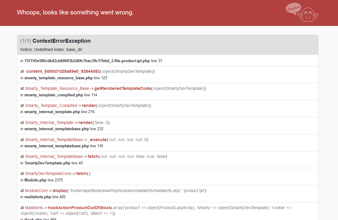 kiri84 Posted June 21, 2019 Share Posted June 21, 2019 (edited) Bonjour, Depuis quelques jours, sans avoir fait de modification, ni mise à jour ( pour une fois ) j'ai ce message d'erreur à l'affichage d'une fiche produit. Tout le reste semble fonctionner. Ce que j'ai testé : - Une restauration de sauvegarde FTP côté ovh , - idem sur ovh pour la base de données J'ai regardé un peu sur les autres topic, qui conseillent de revoir le chmood , de retirer le module posant problème , mais sincèrement je ne vois pas quoi faire. est-ce que cela peut venir des récentes modifications faites par ovh sur les bases de données Merci à vous d'avance pour votre aide --------------------------------------------------------------------------------------------------------------------- Edit: Version prestashop PrestaShop 1.7.5.2 Un thème acheté sur prestaaddons. kidshop version 1.0.2 Conçu par ETS-Soft --------------------------------------------------------------------------- copie du message d'erreur : Quote Whoops, looks like something went wrong. (1/1) ContextErrorException Notice: Undefined index: base_dir in 757745e586cdb42cb60603b2d6fc7bac39c17bbd_2.file.product.tpl.php line 37 at content_5d00d7d29a89e0_92844083(object(SmartyDevTemplate))in smarty_template_resource_base.php line 123 at Smarty_Template_Resource_Base->getRenderedTemplateCode(object(SmartyDevTemplate))in smarty_template_compiled.php line 114 at Smarty_Template_Compiled->render(object(SmartyDevTemplate))in smarty_internal_template.php line 216 at Smarty_Internal_Template->render(false, 0)in smarty_internal_templatebase.php line 232 at Smarty_Internal_TemplateBase->_execute(null, null, null, null, 0)in smarty_internal_templatebase.php line 116 at Smarty_Internal_TemplateBase->fetch(null, null, null, null, false, true, false)in SmartyDevTemplate.php line 40 at SmartyDevTemplateCore->fetch()in Module.php line 2375 at ModuleCore->display('/home/lapetiteda/www/frip/modules/mailalerts/mailalerts.php', 'product.tpl')in mailalerts.php line 485 at MailAlerts->hookActionProductOutOfStock(array('product' => object(ProductLazyArray), 'smarty' => object(SmartyDevTemplate), 'cookie' => object(Cookie), 'cart' => object(Cart), 'altern' => 1))in Hook.php line 966 at HookCore::coreCallHook(object(MailAlerts), 'hookactionProductOutOfStock', array('product' => object(ProductLazyArray), 'smarty' => object(SmartyDevTemplate), 'cookie' => object(Cookie), 'cart' => object(Cart), 'altern' => 1))in Hook.php line 351 at HookCore::callHookOn(object(MailAlerts), 'actionProductOutOfStock', array('product' => object(ProductLazyArray), 'smarty' => object(SmartyDevTemplate), 'cookie' => object(Cookie), 'cart' => object(Cart), 'altern' => 1))in Hook.php line 903 at HookCore::exec('actionProductOutOfStock', array('product' => object(ProductLazyArray), 'smarty' => object(SmartyDevTemplate)), null)in smarty.config.inc.php line 165 at smartyHook(array('h' => 'actionProductOutOfStock', 'product' => object(ProductLazyArray)), object(SmartyDevTemplate)) at call_user_func_array('smartyHook', array(array('h' => 'actionProductOutOfStock', 'product' => object(ProductLazyArray)), object(SmartyDevTemplate)))in SmartyLazyRegister.php line 83 at SmartyLazyRegister->__call('smartyHook', array(array('h' => 'actionProductOutOfStock', 'product' => object(ProductLazyArray)), object(SmartyDevTemplate))) at SmartyLazyRegister->smartyHook(array('h' => 'actionProductOutOfStock', 'product' => object(ProductLazyArray)), object(SmartyDevTemplate)) at call_user_func_array(array(object(SmartyLazyRegister), 'smartyHook'), array(array('h' => 'actionProductOutOfStock', 'product' => object(ProductLazyArray)), object(SmartyDevTemplate)))in bb0ab03e53b80485ec12e1a9d03e3a533a4b56bd_2.file.product-details.tpl.php line 177 at Block_9866749475d00d7d29270a6_69391976->callBlock(object(SmartyDevTemplate))in smarty_internal_runtime_inheritance.php line 248 at Smarty_Internal_Runtime_Inheritance->callBlock(object(Block_9866749475d00d7d29270a6_69391976), object(SmartyDevTemplate))in smarty_internal_runtime_inheritance.php line 184 at Smarty_Internal_Runtime_Inheritance->process(object(SmartyDevTemplate), object(Block_9866749475d00d7d29270a6_69391976))in smarty_internal_runtime_inheritance.php line 156 at Smarty_Internal_Runtime_Inheritance->instanceBlock(object(SmartyDevTemplate), 'Block_9866749475d00d7d29270a6_69391976', 'product_out_of_stock')in bb0ab03e53b80485ec12e1a9d03e3a533a4b56bd_2.file.product-details.tpl.php line 45 at content_5d00d7d293f120_22263682(object(SmartyDevTemplate))in smarty_template_resource_base.php line 123 at Smarty_Template_Resource_Base->getRenderedTemplateCode(object(SmartyDevTemplate))in smarty_template_compiled.php line 114 at Smarty_Template_Compiled->render(object(SmartyDevTemplate))in smarty_internal_template.php line 216 at Smarty_Internal_Template->render()in smarty_internal_template.php line 385 Edited June 21, 2019 by kiri84 résolu (see edit history) Link to comment Share on other sites More sharing options...