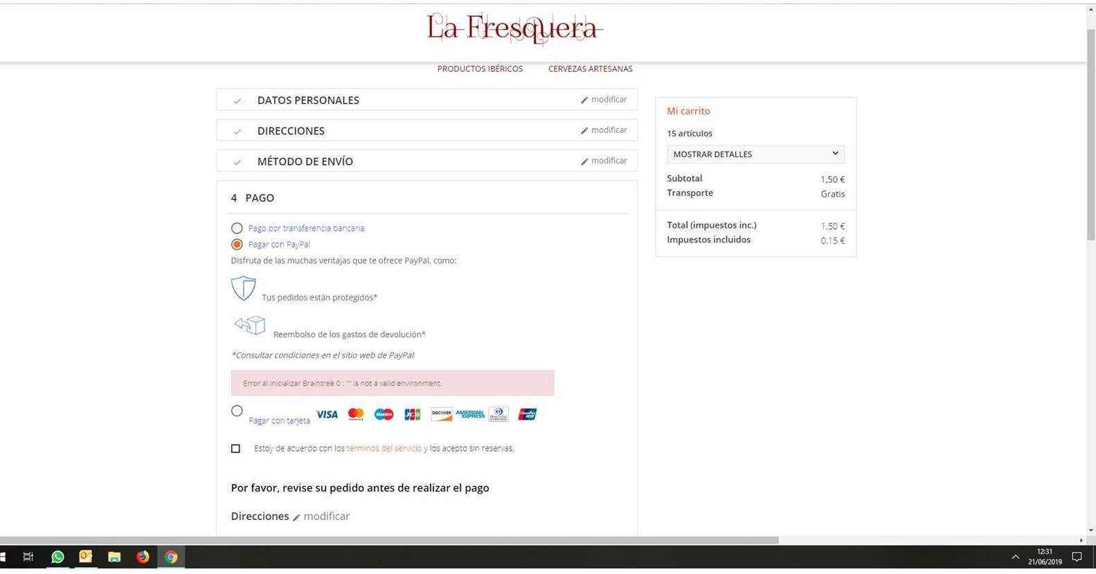 La Fresquera Posted June 21, 2019 Share Posted June 21, 2019 Hola a todos, tengo un problema al pasar al modo real con Braintree y Paypal. Cuando tengo activado el entorno de pruebas todo va bien y puedo realizar los pagos con los dos pero cuando desactivo el entorno de pruebas para hacer una compra real no me deja. Me aparece el siguiente mensaje en Braintree y Paypal: Error al inicializar Braintree 0 : "" is not a valid environment. en el módulo, aparece el siguiente mensaje: You are trying to switch to production account. You should use your production credentials. Please go to the "Products" tab and click on "Modify' for activating the production version of the selected product. y no tengo ni idea de a qué se refiere con la versión de producción del producto seleccionado. La tienda está activada pero da el error tanto activada como en mantenimiento. Ayuda por favor! Rafa Link to comment Share on other sites More sharing options...