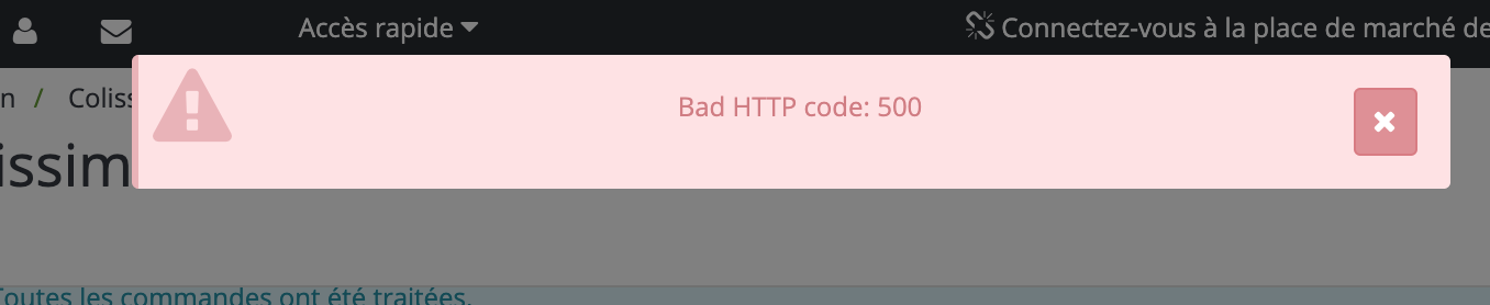 JUJE Triathlon Posted June 24, 2019 Share Posted June 24, 2019 Bonjour, J'ai un bug dans le module colissimo officiel au niveau de l'impression des étiquettes. Lorsque j'essaye d'imprimer les étiquettes j'ai ce message d'erreur : "Erreur sur l'étiquette aller (voir détails)" Puis lorsque je clique sur détails j'ai ce message d'erreur : "Bad HTTP code : 500" Je ne peux donc imprimer aucunes étiquettes, ce qui pose un gros problème pour mes envois. (screenshot en pj). Est-ce que quelqu'un a déjà eu ce problème ? Merci d'avance pour votre aide, Julien Type d’install (nouvelle/MàJ) :Version de PS : 1.6.1.23URL du site concerné : https://www.juje.fr/fr/Thème (défaut/perso) : persoCode (original/modifié) : modifiéHébergement : OVHVersion de PHP :Version de MySQL :Navigateur(s) concerné(s) : Link to comment Share on other sites More sharing options...