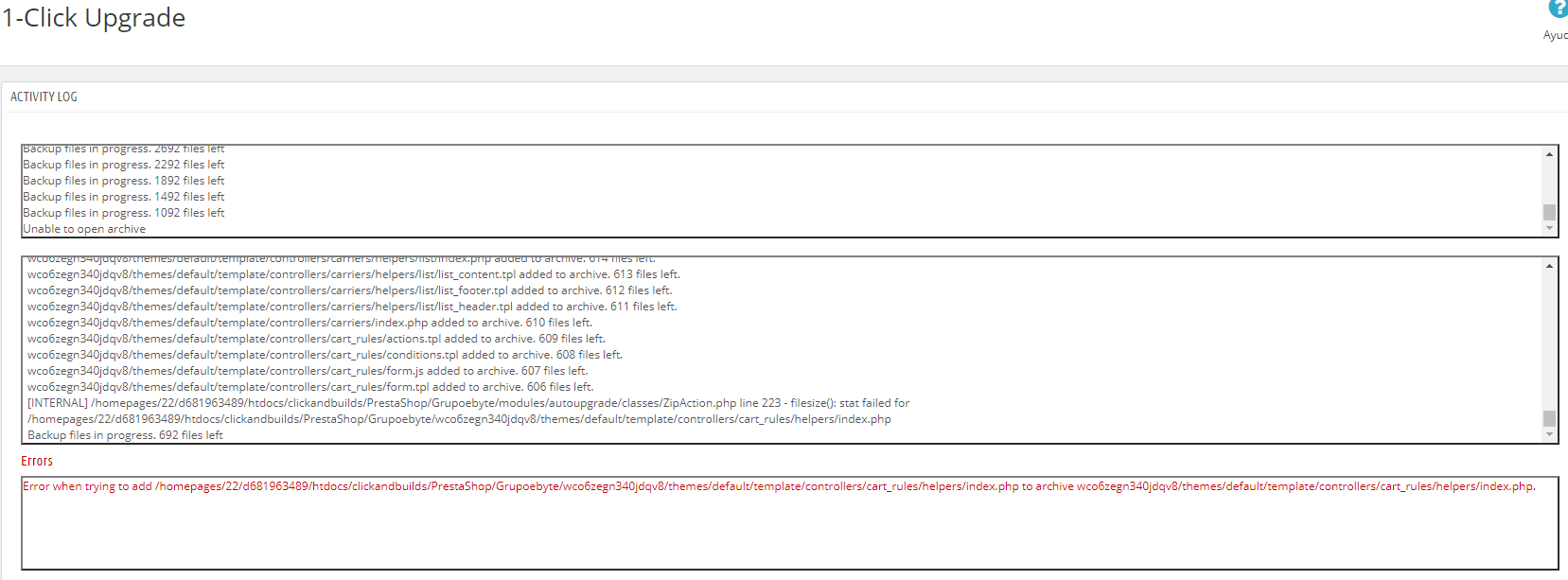 DanMej17 Posted June 25, 2019 Share Posted June 25, 2019 Al momento de intentar actualizar desde el modulo 1-Cli ck Upgrade, todo va bien al inicio (Hace el proceso de forma normal). Hasta que llega un punto en el que me manda este error: Alguna solución? Link to comment Share on other sites More sharing options...
