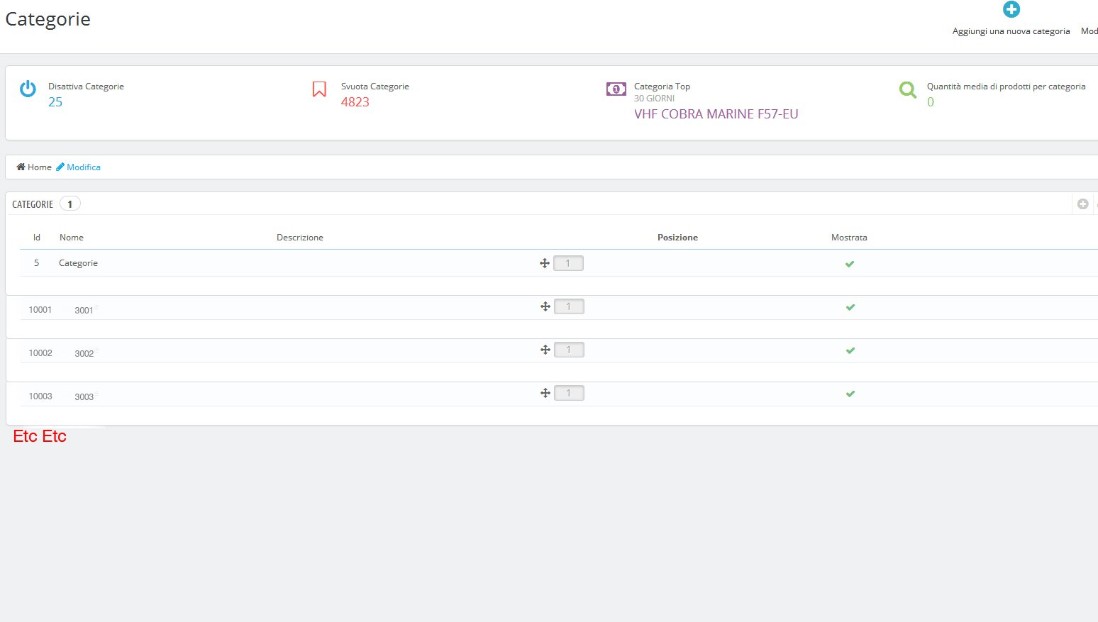 Antoniothevoice Posted June 26, 2019 Share Posted June 26, 2019 Salve, Non mi spiego come mai importando prodotti sulle categorie mi si crea una situazione strana. di fatto i prodotti vengono caricati correttamente però si generano altre cetegorie fuori dalla mia root che ho chiamato Categorie (id 5) che è così strutturata: Categorie (id 5) > Gruppi (id da 10 a120) > categorie sotto gruppi (id da 200 a 280) > sottocategorie (id da 500 a 1000) > serie (id da 1500 a 2500) Nel file di import products è chiaramente specificato nella colonna Parent Categories (x, y, z...) i valori: 1500, 500, 200, 10, 5 Allego un screen shot di una simulazione Link to comment Share on other sites More sharing options...