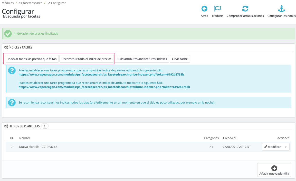 KenedaCS Posted November 1, 2019 Author Share Posted November 1, 2019 Parece que tu Tema no necesita ser actualizado, pero eso no es lo que te está dando problemas, sino la Búsqueda por Facetas... Prueba lo que te digo: guarda tus General Settings, actualiza el módulo de Búsqueda por Facetas, actualiza los índices como te indico en el pantallazo y limpia la caché. Te debería funcionar... Link to comment Share on other sites More sharing options...