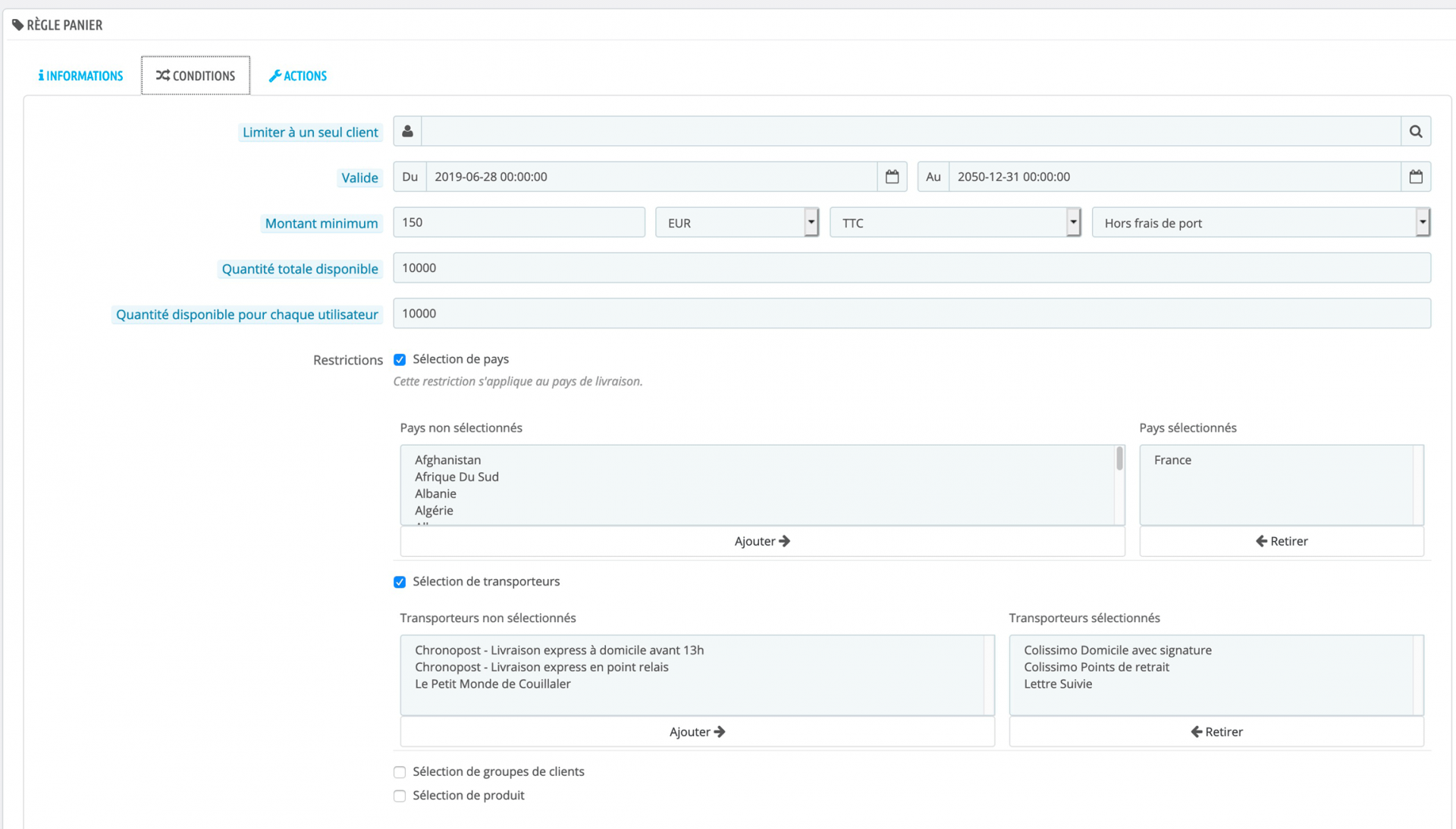 Tom4444 Posted June 28, 2019 Author Share Posted June 28, 2019 (edited) La version de Prestashop 1.6.1.23. Pour paramétrer les frais de port gratuits à partir de 20 euros nous avons simplement ajouté une règle panier dans "Promotions" > "Règles panier" : - Dans "informations, il ne faut pas spécifier de code promo et laisser le champ vide - Dans "conditions", il ne pas pas spécifier de client et laisser le champ "limiter à un seul client" vide ; préciser un éventuel montant minimum d'achat et en mettre une quantité disponible suffisamment élevée - Dans "actions", il faut cocher "oui" pour "livraison gratuit" et sélectionner "aucun" dans "appliquer une réduction" Tenez-nous au courant de ce que ça donne pour vous Edited June 28, 2019 by Tom4444 (see edit history) Link to comment Share on other sites More sharing options...