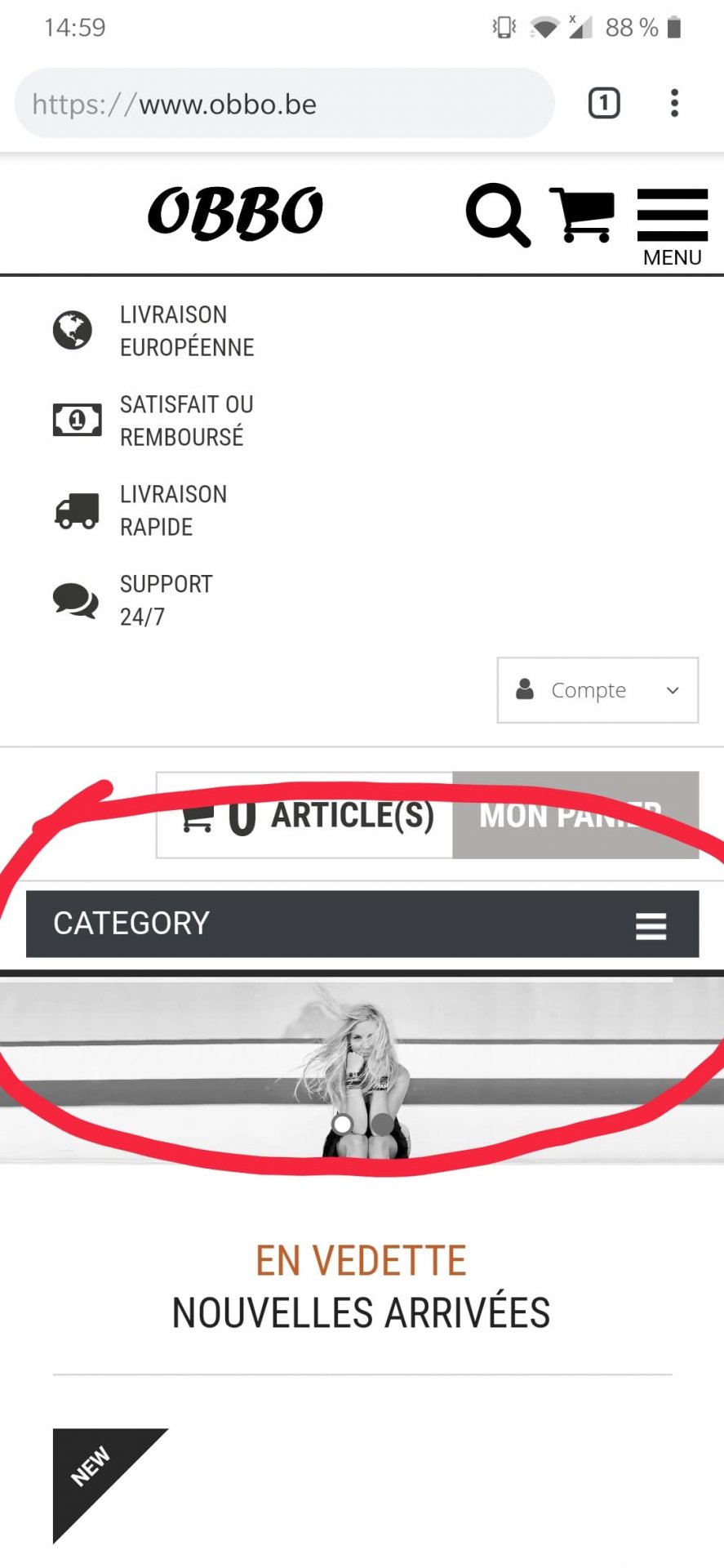 olivierbeauve Posted June 29, 2019 Share Posted June 29, 2019 Bonjour, Mon site : www.obbo.be utilise le thème Rita de posthemes. Sur ordinateur, tout fonctionne nickel. Cependant, sur smartphone, l'affichage des différentes catégories n'est pas très beau (voir photo ci dessous), c'est pourquoi j'ai installé le module "Menu Pour Mobile" qui améliore la visibilité. Ce module fonctionne bien et je peux accéder aux différentes catégories à l'aide d'un menu plus adapté. Malheureusement, le menu "category" reste visible sur smartphone (entouré en rouge). J'aimerai enlever ce menu, avez-vous une idée de comment faire ? Merci. Link to comment Share on other sites More sharing options...