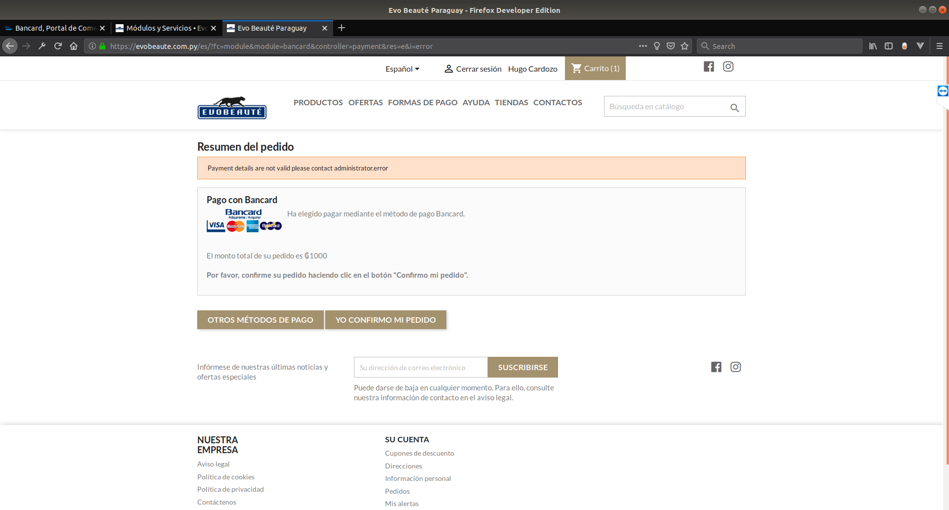 Hola amigos, estoy utilizando la versión 1.7.2.4 de Prestashop y el módulo para pagar con tarjeta de Bancard. Pero tengo un problema. Resulta qué cuándo los usuarios le dan al botón "YO CONFIRMO MI PEDIDO", el sistema da un error »Payment details are not valid please contact administrator.error« y no pueden continuar con la compra. La verdad es que no llegan ni a poder introducir los datos de la tarjeta. ¿Alguien ha tenido el mismo problema? ¿tiene fácil solución?