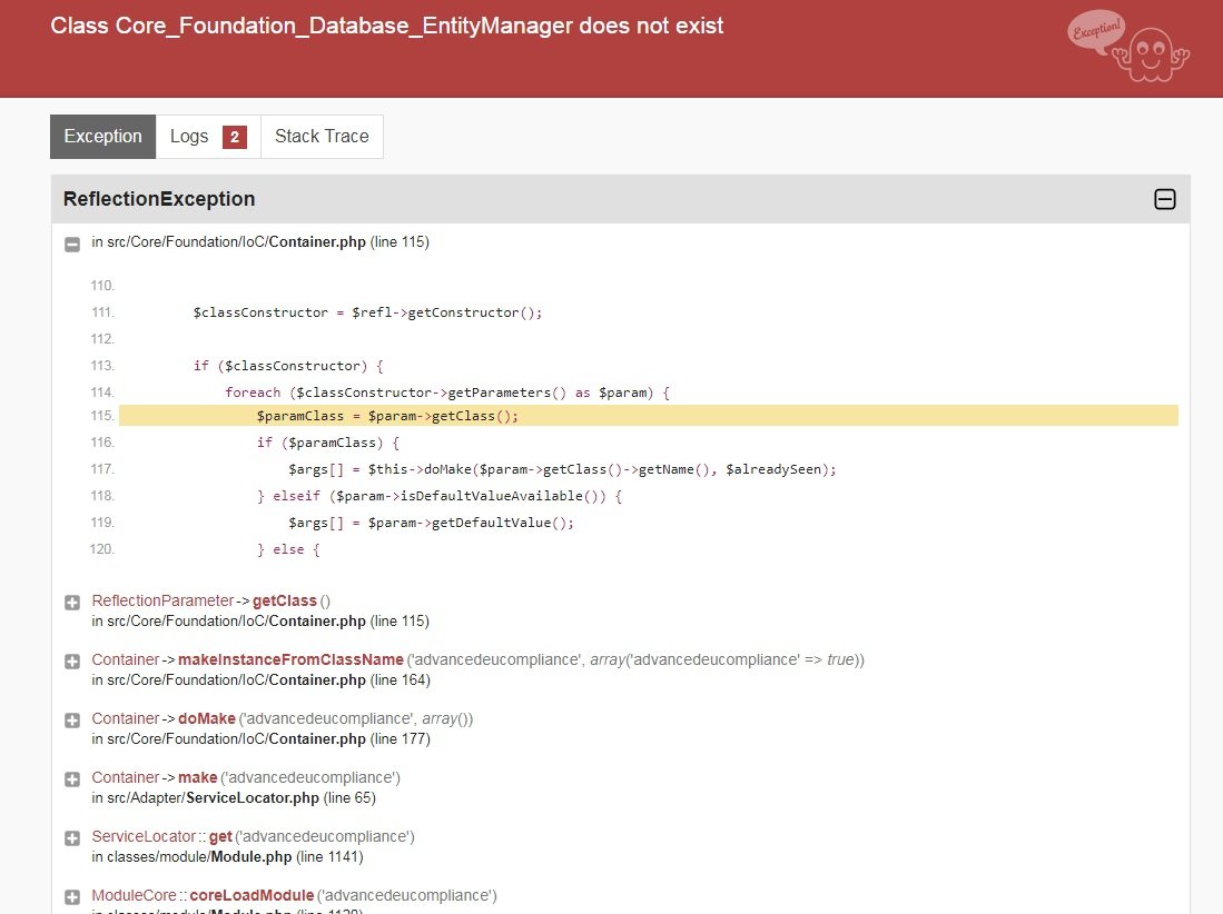 Chuchelandia Posted August 1, 2019 Author Share Posted August 1, 2019 Este es el error que describe el modo depuración a la hora de insertar o cambiar la posición de los modulos en la versión clon 1.7.6 de mi prestashop. Alguien sabe a que puede ser debido? Gracias "La clase Core_Foundation_Database_EntityManager no existe Excepción Registros 2 Seguimiento de pila ReflectionException en src / Core / Foundation / IoC / Container.php (línea 115) $classConstructor = $refl->getConstructor(); if ($classConstructor) { foreach ($classConstructor->getParameters() as $param) { $paramClass = $param->getClass(); if ($paramClass) { $args[] = $this->doMake($param->getClass()->getName(), $alreadySeen); } elseif ($param->isDefaultValueAvailable()) { $args[] = $param->getDefaultValue(); } else { ReflectionParameter -> getClass ()en src / Core / Foundation / IoC / Container.php (línea 115) Contenedor -> makeInstanceFromClassName ('advancedeucompliance', array ('advancedeucompliance' => true ))en src / Core / Foundation / IoC / Container.php (línea 164) Contenedor -> doMake ('advancedeucompliance', array ())en src / Core / Foundation / IoC / Container.php (línea 177) Contenedor -> make ('advancedeucompliance')en src / Adapter / ServiceLocator.php (línea 65) ServiceLocator :: get ('advancedeucompliance')en classes / module / Module.php (línea 1141) ModuleCore :: coreLoadModule ('advancedeucompliance')en classes / module / Module.php (línea 1120) ModuleCore :: getInstanceByName ('advancedeucompliance')en classes / module / Module.php (línea 1888) ModuleCore :: checkModuleFromAddonsApi ('advancedeucompliance')en classes / module / Module.php (línea 1842) ModuleCore :: generateTrustedXml ()en classes / module / Module.php (línea 1737) ModuleCore :: isModuleTrusted ('advancedeucompliance')en classes / module / Module.php (línea 1340) ModuleCore :: getModulesOnDisk ( true )en clases / Dispatcher.php (línea 1120) DispatcherCore :: getModuleControllers ('admin')en controllers / admin / AdminModulesPositionsController.php (línea 468) AdminModulesPositionsControllerCore -> displayModuleExceptionList ( array (), 0)en controllers / admin / AdminModulesPositionsController.php (línea 404) AdminModulesPositionsControllerCore -> renderForm ()en controllers / admin / AdminModulesPositionsController.php (línea 255) AdminModulesPositionsControllerCore -> initContent ()en classes / controller / Controller.php (línea 291) ControllerCore -> run ()en clases / Dispatcher.php (línea 515) DispatcherCore -> dispatch ()en admin506jwvyus / index.php (línea 97)" Link to comment Share on other sites More sharing options...