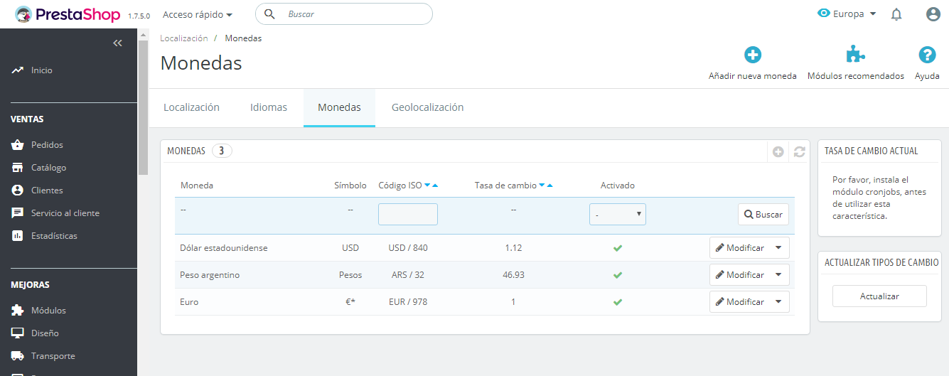 glarosa Posted July 5, 2019 Author Share Posted July 5, 2019 (edited) Hola solucioneseb, ya borré caché. Y nada. Adjunto 3 pantallas de la configuración de las monedas por tienda. Por ejemplo, como la moneda por defecto de la tienda de USA es el dólar, entonces en la conf de moneda de USA, al dólar le pongo 1 en la tasa, y la tasa de las demás según el dólar. Y así con las demás. Tienda USA -> dolar Tienda Europa -> euro Tienda Argentina -> peso arg Lo que quiero es: agregar un producto una sola vez, (arriba a la derecha, donde dice el nombre de la tienda, seteado en All Shop), y que el precio que coloque en pesos, (porq es la moneda por defecto) se convierta automáticamente en todas las tiendas según su moneda. El cliente tiene 2mil productos, no puede entrar a cada producto a poner el precio en dólares, euros y pesos , necesita que se llene una sola vez y se convierta según la tasa. Eso se puede? Qué debo hacer? Gracias! Edited July 5, 2019 by glarosa (see edit history) Link to comment Share on other sites More sharing options...