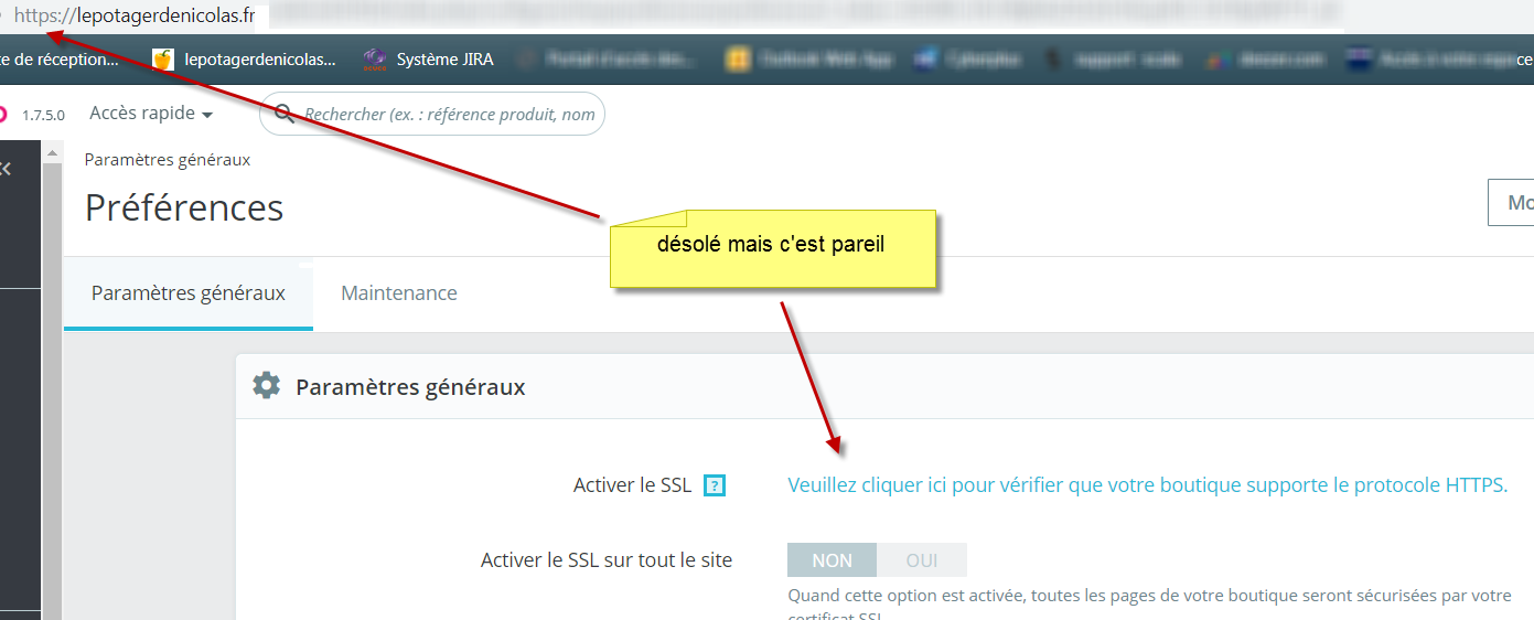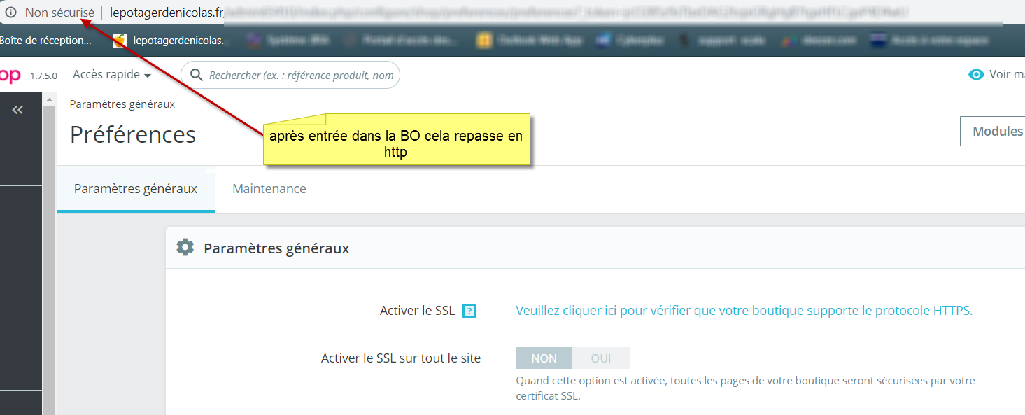pprieu Posted July 8, 2019 Author Share Posted July 8, 2019 merci pour l'info c'est justement ce que je n'arrive pas a faire, lorsque je vais dans le BO, je n'arrive pas a basculer en https, après action il ne se passe rien, le bouton ssl reste grisé. Link to comment Share on other sites More sharing options...