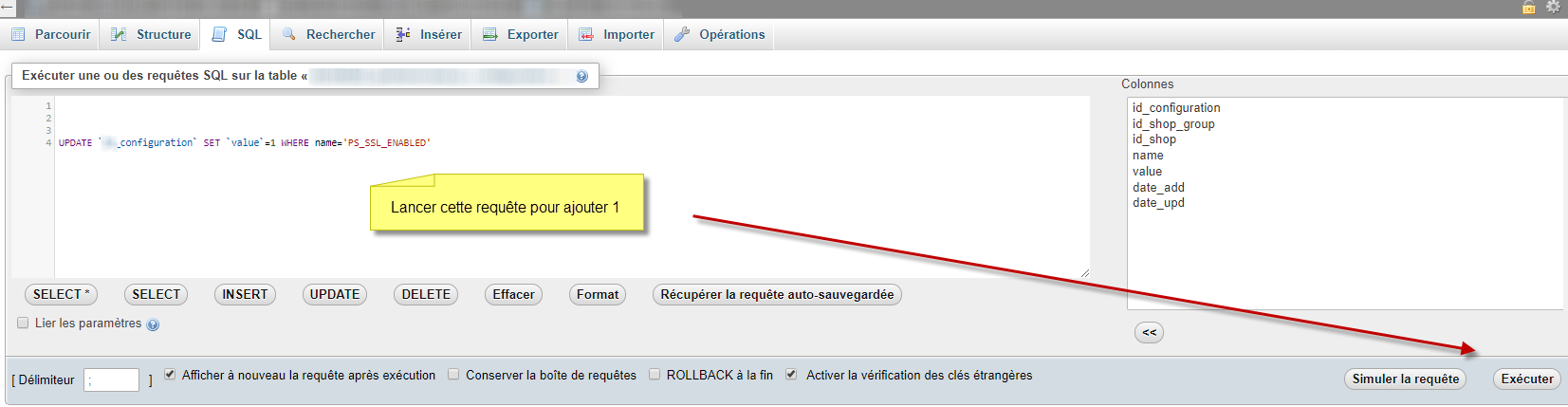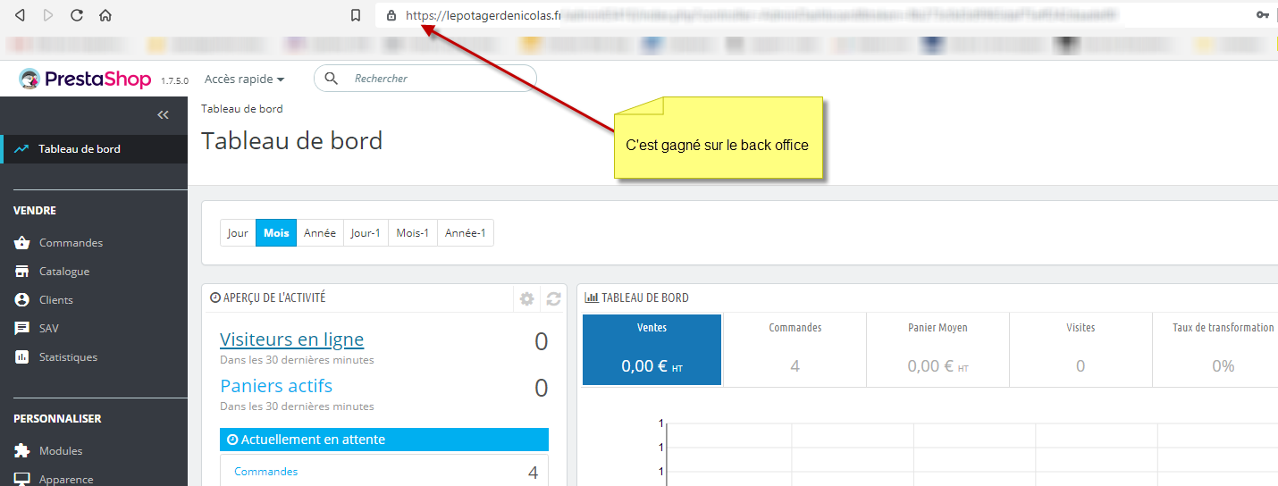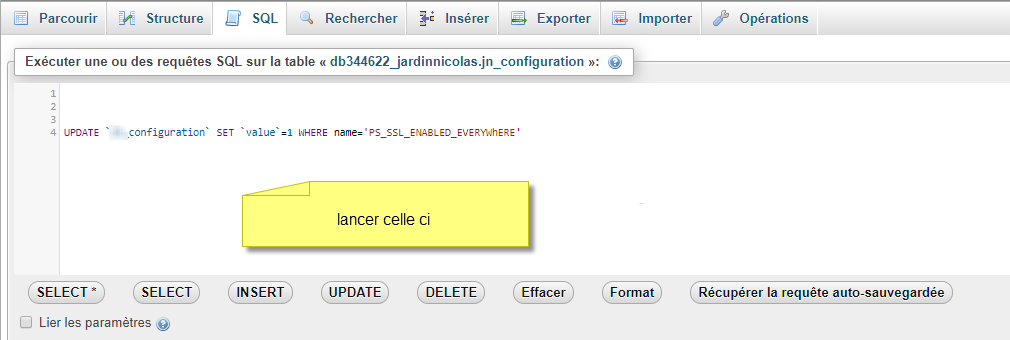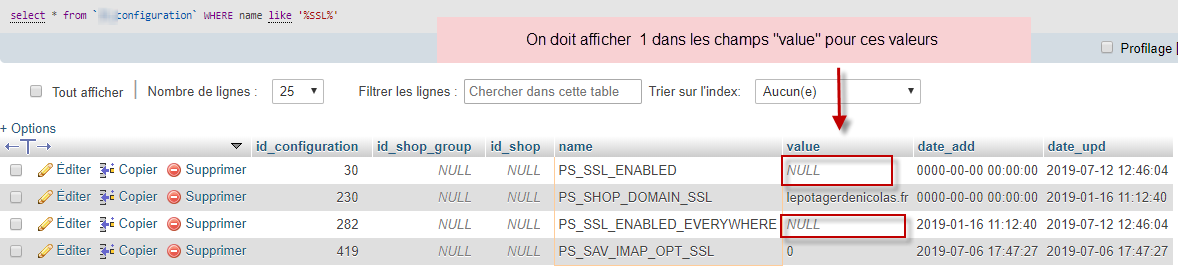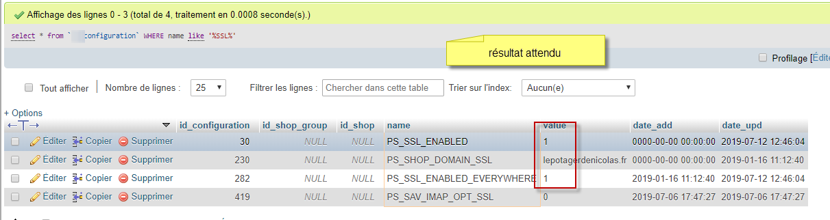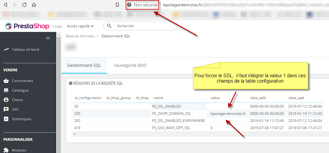 pprieu Posted August 22, 2019 Author Share Posted August 22, 2019 (edited) La solution viens d’apparaître, je remercie les personnes suivantes pour leur aide: doekia qui m'a aidé au début Germain Tenthorey dit Webbax qui m'a fourni un contact (https://www.webbax.ch/) Johan LETROUIT qui a pris du temps pour regarder (https://digiactif.fr/) et enfin Arnaud Merigeau qui m'a donné la piste que je vais vous décrire (https://www.arnaud-merigeau.fr/) La solution est de passer une valeur 1 dans le paramètre qui gère le SSL dans la base de données, Voici la description des opérations: il faut ouvrir l'interface PHPmySQL chez votre hébergeur Voici les trois requêtes utilisées: --pensez a remplacer XX si vous avez personnalisé les entêtes de tables (prestashop propose PS par défaut) select * from `XX_configuration` WHERE name like '%SSL%' UPDATE `XX_configuration` SET `value`=1 WHERE name='PS_SSL_ENABLED' UPDATE `XX_configuration` SET `value`=1 WHERE name='PS_SSL_ENABLED_EVERYWhERE' Et voilà le site https://lepotagerdenicolas.fr sera vu par Google . Ce site est destiné à la population locale des hautes-Pyrénées mais il permettra de ne pas jeter des produits par manque de client, la récolte sera faite, juste ce qu'il faut pour ne pas gaspiller. Encore merci à tous philippe Edited August 22, 2019 by pprieu (see edit history) Link to comment Share on other sites More sharing options...