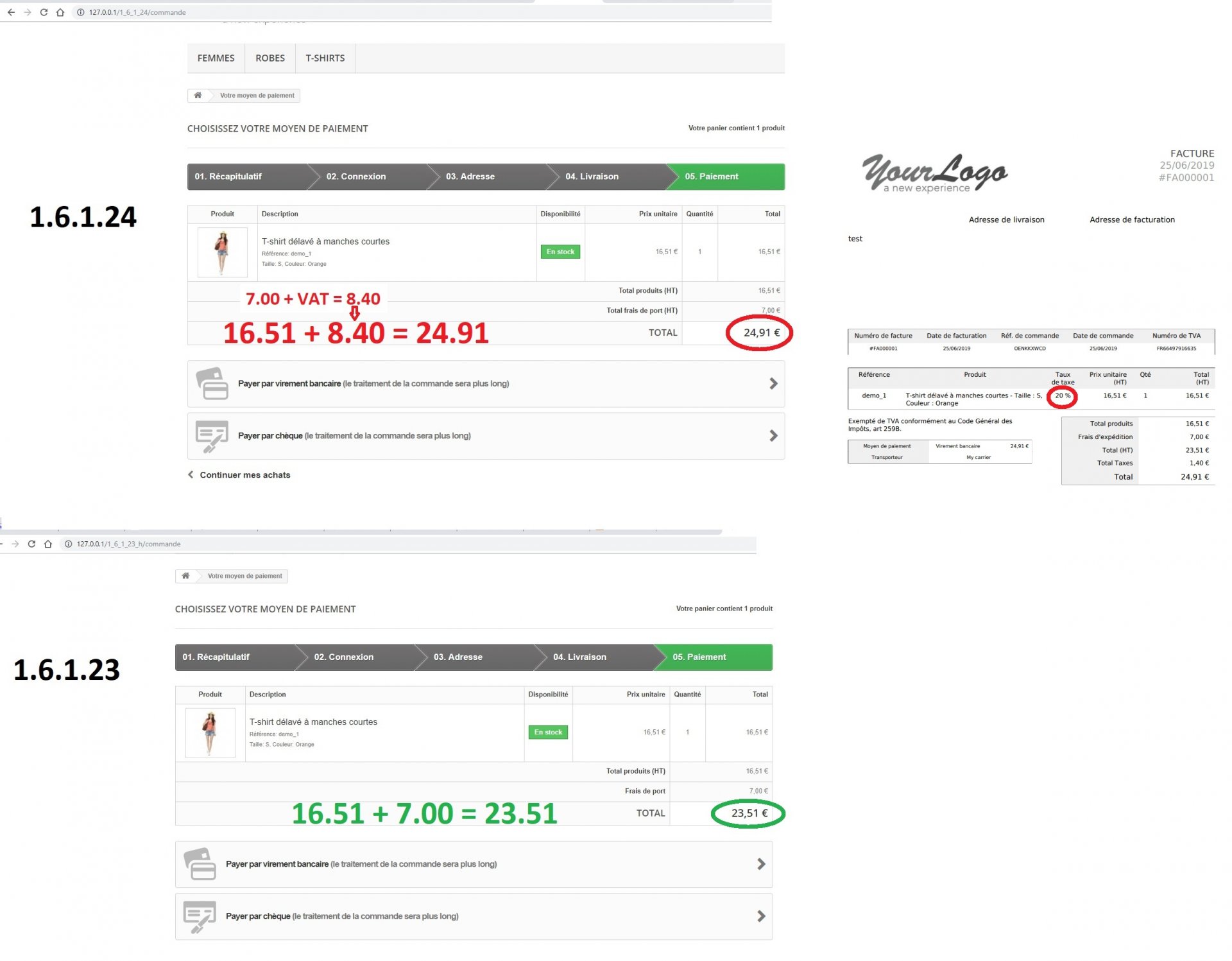 coeos.pro Posted July 11, 2019 Share Posted July 11, 2019 (edited) je viens de tester la 1.7.6.0 et apparemment elle corrige un bug de TVA présent sur 1.7.5.2 (et 1.6.1.24 aussi). Si un client met un numéro de TVA valide il paye HT les produits mais TTC les frais de ports avec un affichage de taux de TVA différent de 0 dans la facture. Donc pour le coup, autant passer sur 1.7.6.0, en attendant de trouver d’autres bugs. Exemple sur 1.6.1.24 : Précision : le test a été effectué sur 2 boutiques fraîchement installées et avec le module gratuit Numéro de TVA européen v.2.1.0 de prestashop avec comme comme pays Allemagne et en numéro de TVA FR66497916635 Edited July 11, 2019 by coeos.pro précision (see edit history) 1 1 Link to comment Share on other sites More sharing options...