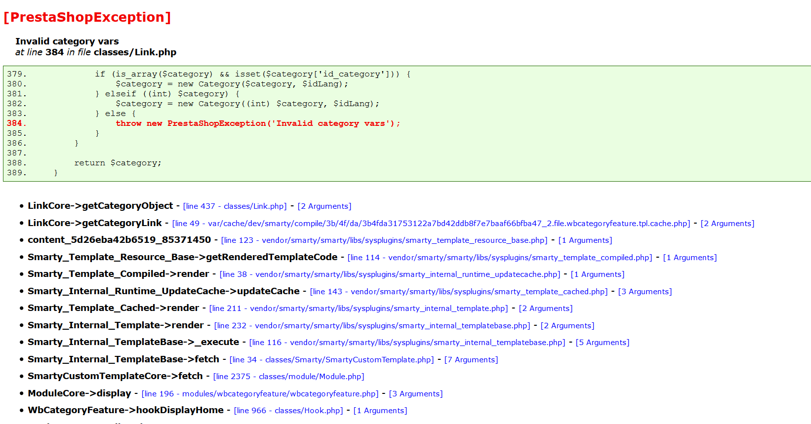 [PrestaShopException] Invalid category vars at line 384 in file classes/Link.php 379. if (is_array($category) && isset($category['id_category'])) { 380. $category = new Category($category, $idLang); 381. } elseif ((int) $category) { 382. $category = new Category((int) $category, $idLang); 383. } else { 384. throw new PrestaShopException('Invalid category vars'); 385. } 386. } 387. 388. return $category; 389. } LinkCore->getCategoryObject - [line 437 - classes/Link.php] - [2 Arguments] LinkCore->getCategoryLink - [line 49 - var/cache/dev/smarty/compile/3b/4f/da/3b4fda31753122a7bd42ddb8f7e7baaf66bfba47_2.file.wbcategoryfeature.tpl.cache.php] - [2 Arguments] content_5d26eba42b6519_85371450 - [line 123 - vendor/smarty/smarty/libs/sysplugins/smarty_template_resource_base.php] - [1 Arguments] Smarty_Template_Resource_Base->getRenderedTemplateCode - [line 114 - vendor/smarty/smarty/libs/sysplugins/smarty_template_compiled.php] - [1 Arguments] Smarty_Template_Compiled->render - [line 38 - vendor/smarty/smarty/libs/sysplugins/smarty_internal_runtime_updatecache.php] - [1 Arguments] Smarty_Internal_Runtime_UpdateCache->updateCache - [line 143 - vendor/smarty/smarty/libs/sysplugins/smarty_template_cached.php] - [3 Arguments] Smarty_Template_Cached->render - [line 211 - vendor/smarty/smarty/libs/sysplugins/smarty_internal_template.php] - [2 Arguments] Smarty_Internal_Template->render - [line 232 - vendor/smarty/smarty/libs/sysplugins/smarty_internal_templatebase.php] - [2 Arguments] Smarty_Internal_TemplateBase->_execute - [line 116 - vendor/smarty/smarty/libs/sysplugins/smarty_internal_templatebase.php] - [5 Arguments] Smarty_Internal_TemplateBase->fetch - [line 34 - classes/Smarty/SmartyCustomTemplate.php] - [7 Arguments] SmartyCustomTemplateCore->fetch - [line 2375 - classes/module/Module.php] ModuleCore->display - [line 196 - modules/wbcategoryfeature/wbcategoryfeature.php] - [3 Arguments] WbCategoryFeature->hookDisplayHome - [line 966 - classes/Hook.php] - [1 Arguments] HookCore::coreCallHook - [line 351 - classes/Hook.php] - [3 Arguments] HookCore::callHookOn - [line 903 - classes/Hook.php] - [3 Arguments] HookCore::exec - [line 39 - controllers/front/IndexController.php] - [1 Arguments] IndexControllerCore->initContent - [line 281 - classes/controller/Controller.php] ControllerCore->run - [line 511 - classes/Dispatcher.php] DispatcherCore->dispatch - [line 28 - index.php]