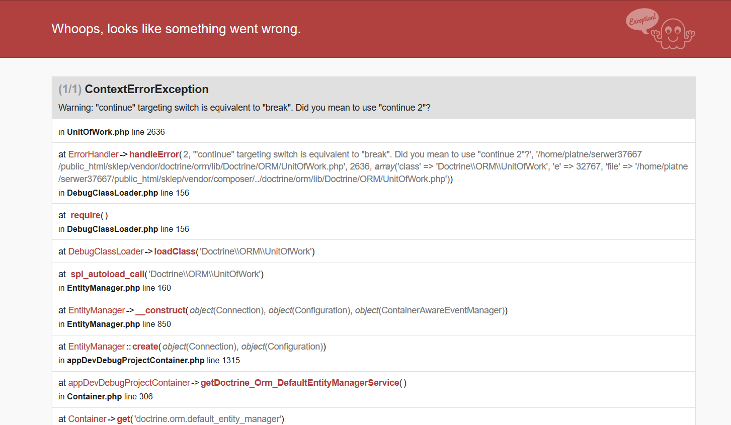 Whoops, looks like something went wrong. (1/1) ContextErrorException Warning: "continue" targeting switch is equivalent to "break". Did you mean to use "continue 2"? in UnitOfWork.php line 2636 at ErrorHandler->handleError(2, '"continue" targeting switch is equivalent to "break". Did you mean to use "continue 2"?', '/home/platne/serwer37667/public_html/sklep/vendor/doctrine/orm/lib/Doctrine/ORM/UnitOfWork.php', 2636, array('class' => 'Doctrine\\ORM\\UnitOfWork', 'e' => 32767, 'file' => '/home/platne/serwer37667/public_html/sklep/vendor/composer/../doctrine/orm/lib/Doctrine/ORM/UnitOfWork.php'))in DebugClassLoader.php line 156 at require()in DebugClassLoader.php line 156 at DebugClassLoader->loadClass('Doctrine\\ORM\\UnitOfWork') at spl_autoload_call('Doctrine\\ORM\\UnitOfWork')in EntityManager.php line 160 at EntityManager->__construct(object(Connection), object(Configuration), object(ContainerAwareEventManager))in EntityManager.php line 850 at EntityManager::create(object(Connection), object(Configuration))in appDevDebugProjectContainer.php line 1315 at appDevDebugProjectContainer->getDoctrine_Orm_DefaultEntityManagerService()in Container.php line 306 at Container->get('doctrine.orm.default_entity_manager')in ManagerRegistry.php line 48 at ManagerRegistry->getService('doctrine.orm.default_entity_manager')in AbstractManagerRegistry.php line 231 at AbstractManagerRegistry->getManagers()in ProxyCacheWarmer.php line 49 at ProxyCacheWarmer->warmUp('/home/platne/serwer37667/public_html/sklep/var/cache/dev')in CacheWarmerAggregate.php line 52 at CacheWarmerAggregate->warmUp('/home/platne/serwer37667/public_html/sklep/var/cache/dev')in Kernel.php line 680 at Kernel->initializeContainer()in Kernel.php line 135 at Kernel->boot()in Kernel.php line 195 at Kernel->handle(object(Request), 1, false)in index.php line 88