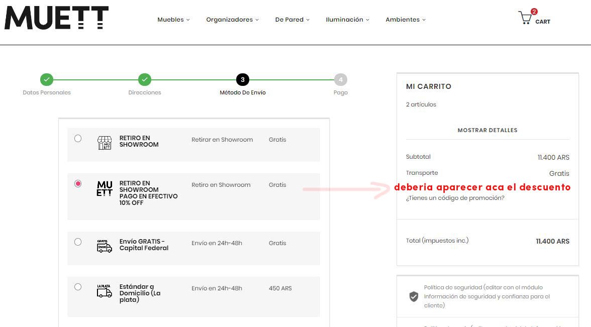 Muett Posted July 16, 2019 Share Posted July 16, 2019 hola, problema en version 1.7.5.0 no estamos logrando que se aplique una condición de descuento en carrito por regla de envio. La idea es que si elegis en tipo de envio " RETIRO EN SHOWROOM PAGO EN EFECTIVO CON 10% OFF" como método de envío, se aplique un descuento sobre la compra. NO queremos que haya que agregar un CODIGO sino que aplique automáticamente a todos los clientes al elegir ese tipo de envio. NO sabemos por qué dejó de funcionar, en un momento funcionaba. alguien nos puede ayudar? GRACIAS Link to comment Share on other sites More sharing options...