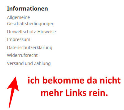 AMSPO24-Online Posted July 21, 2019 Author Share Posted July 21, 2019 oder allgemeine Frage: Wie kann ich in dem Footer-Bereich die Kategorien und Seiten Anpassen unter "Link Widget"? Wie werden die richtig Eingestellt. Auf paar komme ich drauf, aber nicht auf Alle. Da ist auch dieses Modul bei mir eingerichtet: Rechtssicherheit. Ich müsste auf diesem Modul noch 2 Seiten eintragen. Gebe ich auf "Rechtssicherheit" -> " VERWALTUNG RECHTSKONFORMER INHALTE" eine neue Seite ein, wird diese Angezeigt, aber auf der Falschen Seite "im Footer Bereich" und es lässt sich nicht auf einen anderen Bereich ändern, was ich gerne hätte. Link to comment Share on other sites More sharing options...