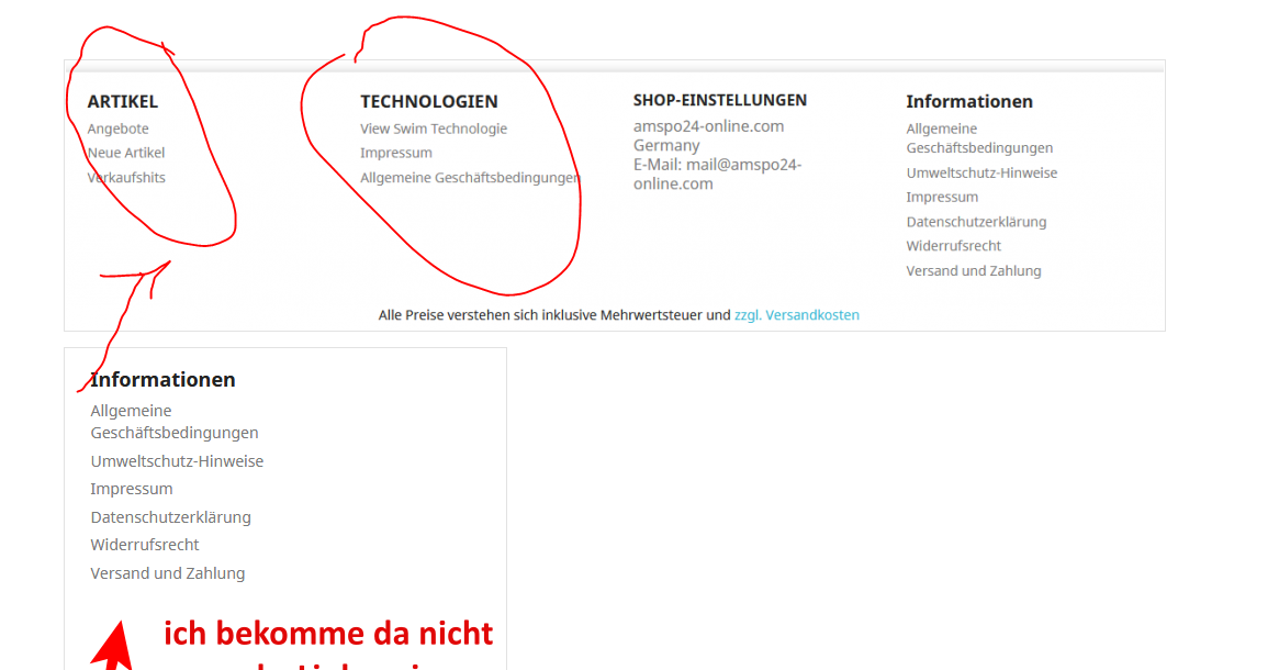 AMSPO24-Online Posted July 19, 2019 Author Share Posted July 19, 2019 oder kann mir jemand sagen, wo ich die Daten, die ich Benötige ändern kann, per FTP oder Datenbank? Wie z. Beispiel möchte ich im Footer 1 bis 4 wie im Bild Beschrieben "rechts" -> "Informationen" auf "INFORMATIONEN" ändern? und auch in der Kategorie "SHOP-EINSTELLUNGEN" entern auf "was weiß ich"? Link to comment Share on other sites More sharing options...