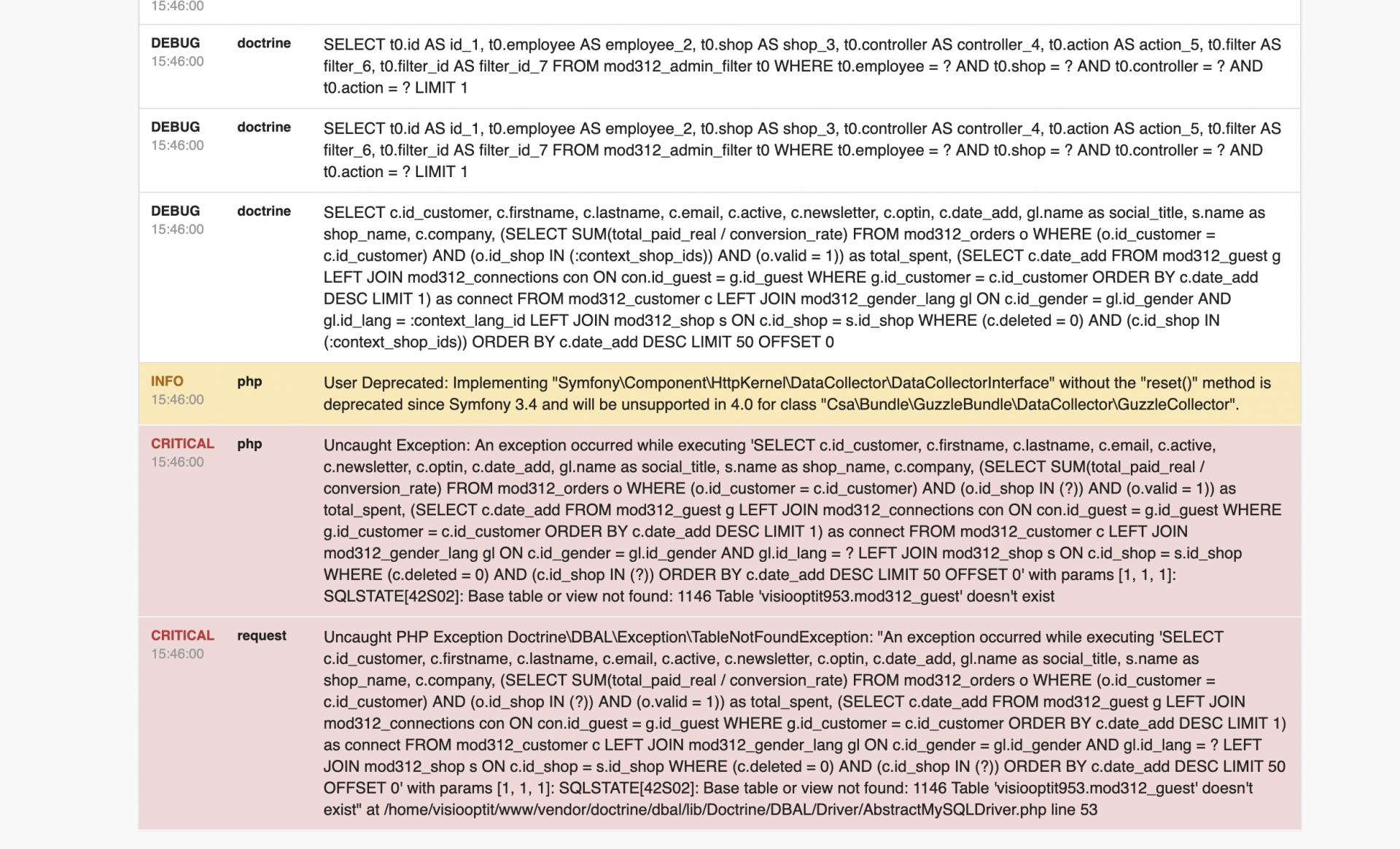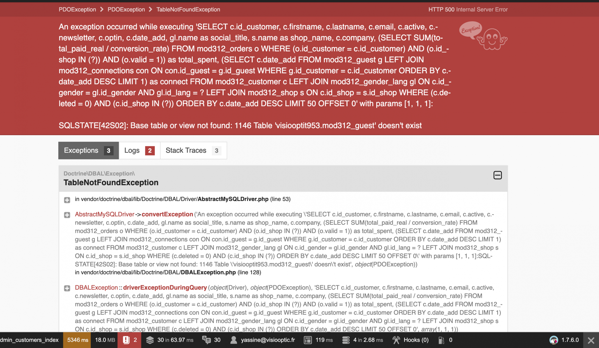 yanis1812 Posted July 18, 2019 Share Posted July 18, 2019 Bonjour, Je suis confronté à un problème, dans mon back office quand je clique sur client, j'ai un message d'erreur de ce type qui s'affiche Oops! An Error Occurred The server returned a "500 Internal Server Error". Something is broken. Please let us know what you were doing when this error occurred. We will fix it as soon as possible. Sorry for any inconvenience caused. j'ai fait une restauration avec ovh mais rien n'y fait Voici les informations donné en mode debug merci pour votre aide Link to comment Share on other sites More sharing options...