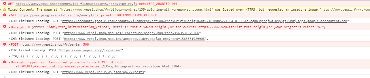 Eolia Posted July 19, 2019 Share Posted July 19, 2019 En écrivant l'url à la main, ok on arrive sur votre site qui rame comme pas possible. Ajout au panier depuis une catégorie: un message d'erreur Retour de l'url ajax: Request URL: https://www.vepsi.shop/fr/panier Request Method: POST Status Code: 500 Ajout depuis la page produit: 135-goldring-with-oregon-sunstone.html:3784 Uncaught TypeError: Cannot set property 'innerHTML' of null at XMLHttpRequest.xmlhttp.onreadystatechange (135-goldring-with-oregon-sunstone.html:3784) Et de nouveau l'erreur 500. Donc activez le mode d'affichage des erreurs et allez consulter le fichier error.log du serveur. Votre console déborde d'erreurs également... Link to comment Share on other sites More sharing options...