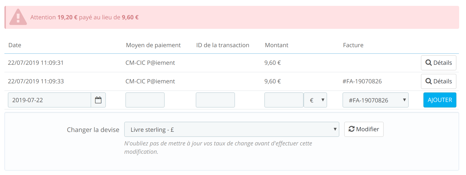 tdf-mep Posted July 25, 2019 Share Posted July 25, 2019 30 minutes ago, digeek said: Nous avons du Paypal (en sandbox pour l'instant) sur la boutique qui rencontre le soucis des paiements. Les paiements réalisés sont bien validés (à contrario des paiements Sogenactif 2.0) Pour PayPal : Erreur affiché au client (cf screenshot) Erreur de validation de la commande : The locale 2 is invalid. Votre paiement a été effectué. Contactez le Service clientèle. Paiement accepté (PayPal envoie un mail de confirmation) Dans le back office : état de la commande non mise à jour Je pensé qu'il s'agissait du même problème, mais après vérification, pas d'erreur dans les log serveur ToolsCore::displayPrice => ToolsCore::getContextLocale(Object(Context)) => peut être qu'il s'agit d'un autre problème, je vais creuser NB : test Paypal également réalisé après mise à jour manuel de la table ps_currency ( numeric_iso_code & precision cf : https://github.com/PrestaShop/PrestaShop/issues/14608 ) Pour CM-CIC P@iement (cf deuxième post de ce thread) : Paiement accepté Pas d'erreur affiché au client Dans les log serveur, visiblement comme sur beaucoup d'autre module de paiement, erreur ToolsCore::displayPrice => ToolsCore::getContextLocale(Object(Context)) Dans le back office : état de la commande non mise à jour NB : je ne suis pas sur que CM-CIC P@iement sont contrôlé par PayBox comme indiqué par plus haut dans ce thread par flyman30 Link to comment Share on other sites More sharing options...