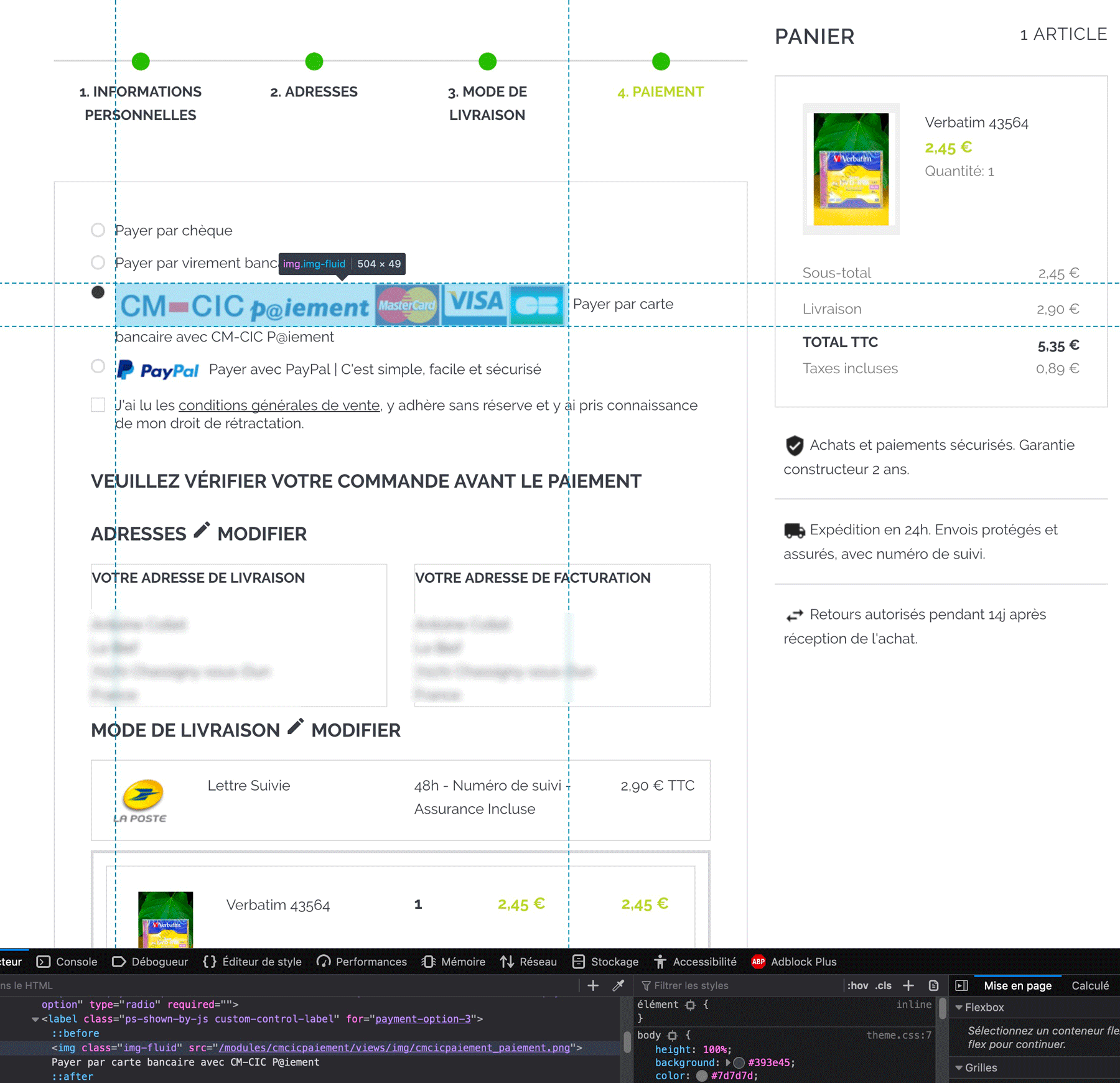 couillaler Posted July 23, 2019 Share Posted July 23, 2019 Bonjour, Parfois aussi, l'inspecteur (nom de la fonction dans Firefox, pour les autres, je ne sais pas) du navigateur internet permet aussi de retrouver quelques fichiers. Pour ta facture, cela ne devrait pas pouvoir servir, mais pour d'autres, c'est le cas, voilà pourquoi je partage l'info. Dans Firefox (Mac), pour l'afficher il faut aller dans Outils/Développement Web/Inspecteur Ensuite, sur la page sur laquelle on veut avoir des infos, on survole la zone avec sa souris, ou on clique, et l'inspecteur en dessous indique des infos sur la zone survolée (il a aussi d'autres fonctions mais ici, on ne veut qu'avoir des infos). Cela peut donner des liens vers un fichier. Par exemple sur cette page de confirmation de commande, on peut voir où se terre l'image utilisée par le module de paiement. L'idée ici est d'en réduire la taille (ce n'est pas encore fait sur la copie d'écran), et je cherchais où se trouvait le fichier. Comme l'indique l'inspecteur en bas, elle se trouve dans le dossier /modules/cmcicpaiement/views/img/cmcicpaiement_paiement.png Je m'en suis déjà servi pour voir aussi quels fichiers modifier lors de telle ou telle étape du processus de commande pour intégrer des scripts. Bref, c'est utile comme fonction. Pour une fois, et je ne le dirais pas souvent dans ma vie, vive l'inspecteur ! Antoine Link to comment Share on other sites More sharing options...