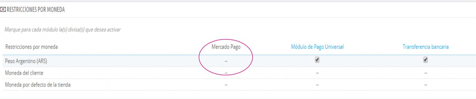 aide_cv Posted July 24, 2019 Author Share Posted July 24, 2019 Buenas tardes. tengo un problema con la opcion de pago "mercado pago". lo estuve usando a la perfeccion y desde hace 1 dia q por si solo desaparecio de la opcion de pagos. Sin embargo el modulo esta instalado correctamente, y lo unico raro q encuentro es en el sector de "medios de pago" en RESTRICCIONES POR MONEDA, en este campo no tengo la opcion para activar , en la configuracion del modulo de mercado pago esta activada. por favor necesito ayuda..gracias.!! Link to comment Share on other sites More sharing options...