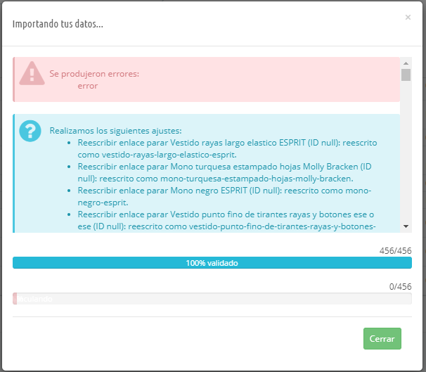 adrian135 Posted July 26, 2019 Share Posted July 26, 2019 (edited) Hola Gente, Tengo un problemilla que no me habia ocurrido hasta ahora. Os pongo en situacion he creado una instalacion de prestashop 1.7.5.2 ara unas semanas y despues de dejarlo configurado. A la hora de subir los productos al prestashop me aparece este error: Se produjeron errores: Error. He intentado buscar algo por internet y nada. ¿Alguien me podria decir que puede ser este error? O como lo ha solucionado. He probado ha cambiar algunos campos pero sigue sin darme algun error concreto. Muchas gracias a todos. Edited July 31, 2019 by adrian135 (see edit history) Link to comment Share on other sites More sharing options...