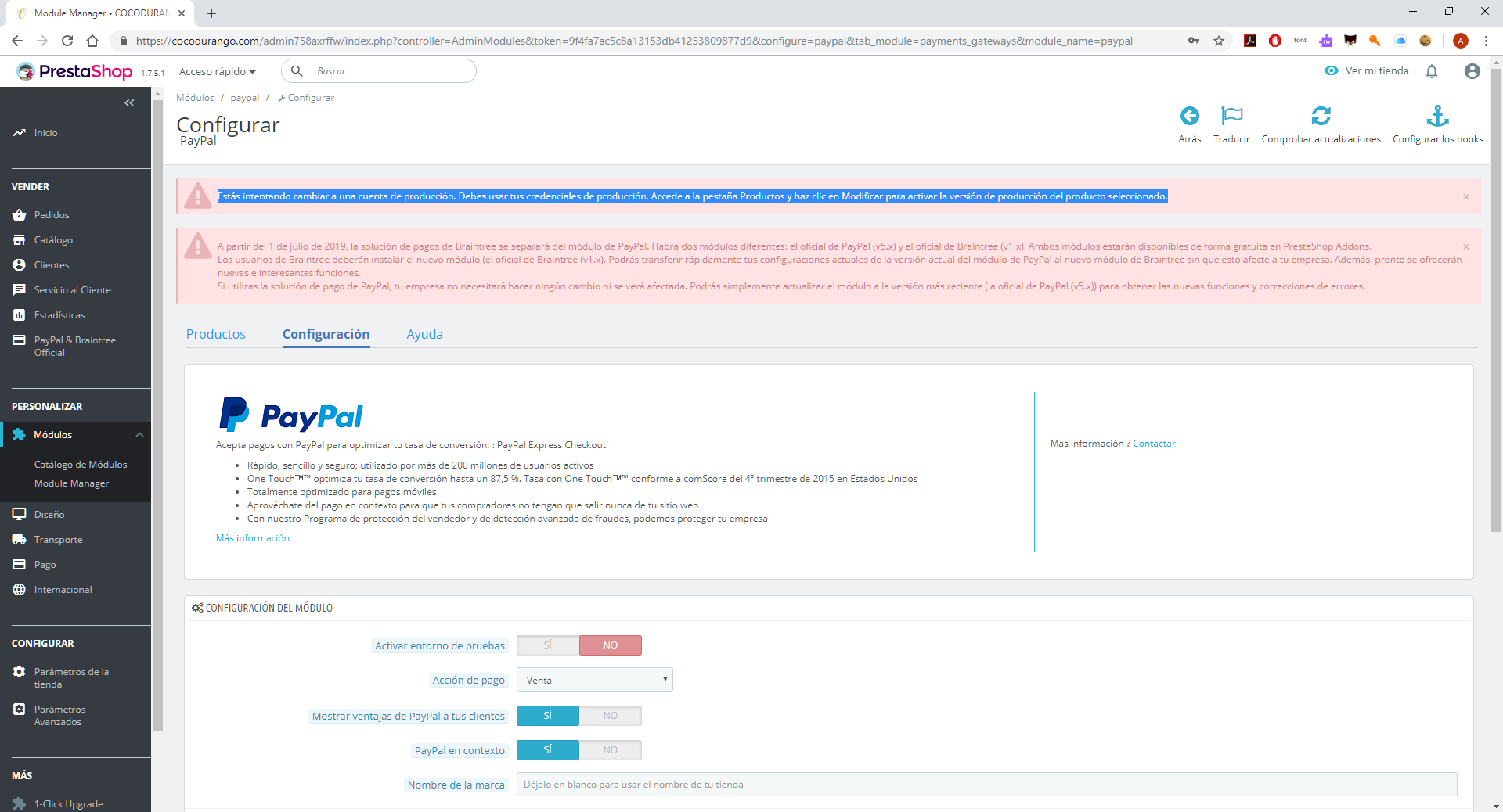 analuzsandrea Posted August 2, 2019 Author Share Posted August 2, 2019 Hola Gracias por tu respuesta ¿Es Prestashop 1.7? es 1.7.5.1 ¿Has instalado el módulo oficial de Paypal gratuito?, ¿o es otro de pago? El gratuito sale como paypal & braintree ¿Lo has configurado dentro del backoffice y te da algún error? al activarlo me aparece esto en rojo Estás intentando cambiar a una cuenta de producción. Debes usar tus credenciales de producción. Accede a la pestaña Productos y haz clic en Modificar para activar la versión de producción del producto seleccionado. ¿Has modificado código del módulo después de instalarlo? Nop Las configuraciones de pago referencias estan todas activadas Link to comment Share on other sites More sharing options...