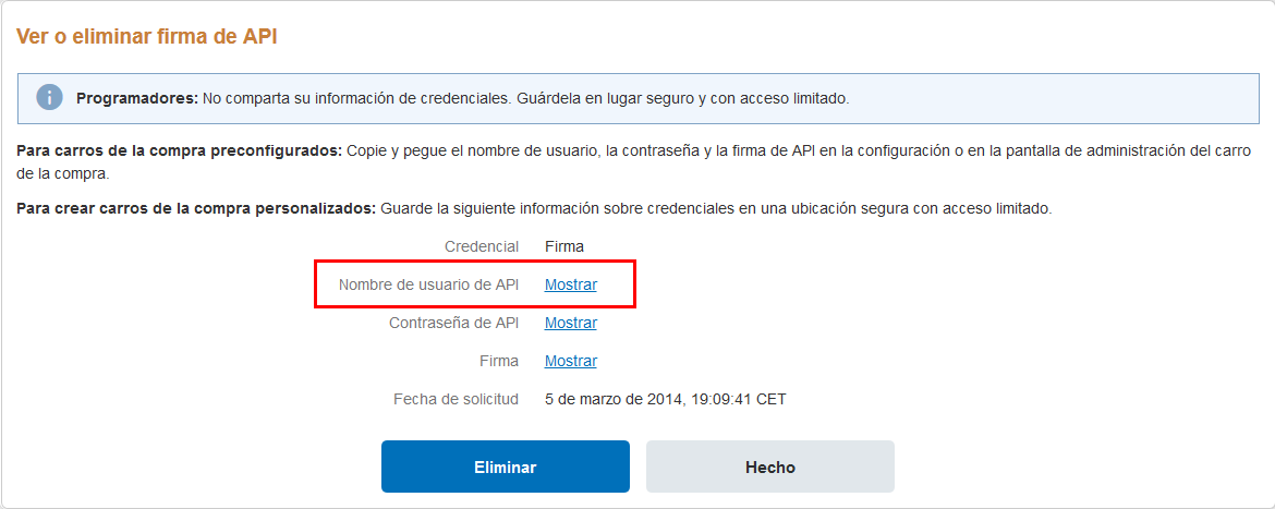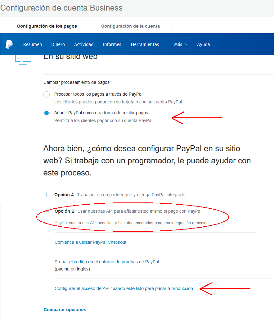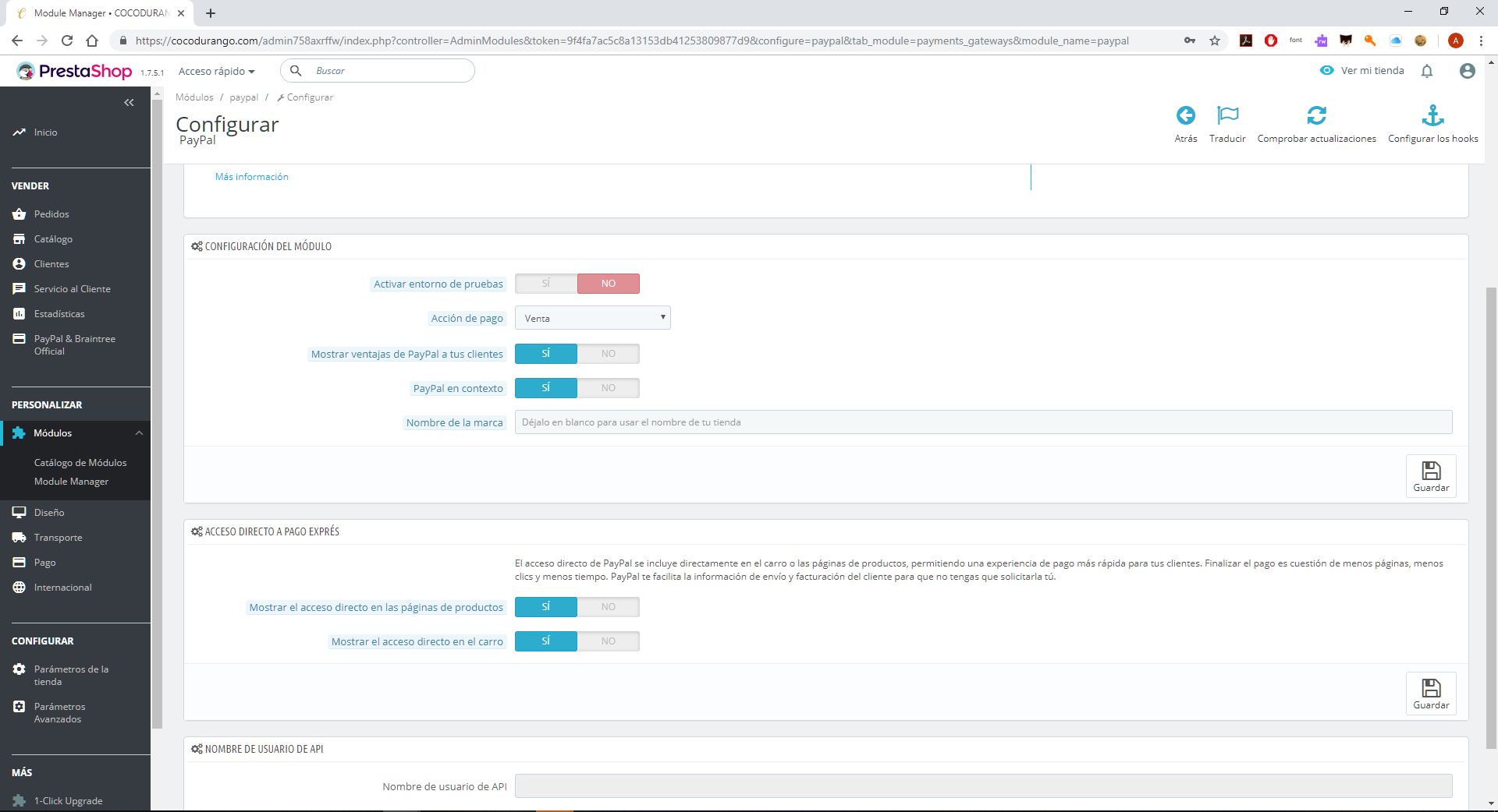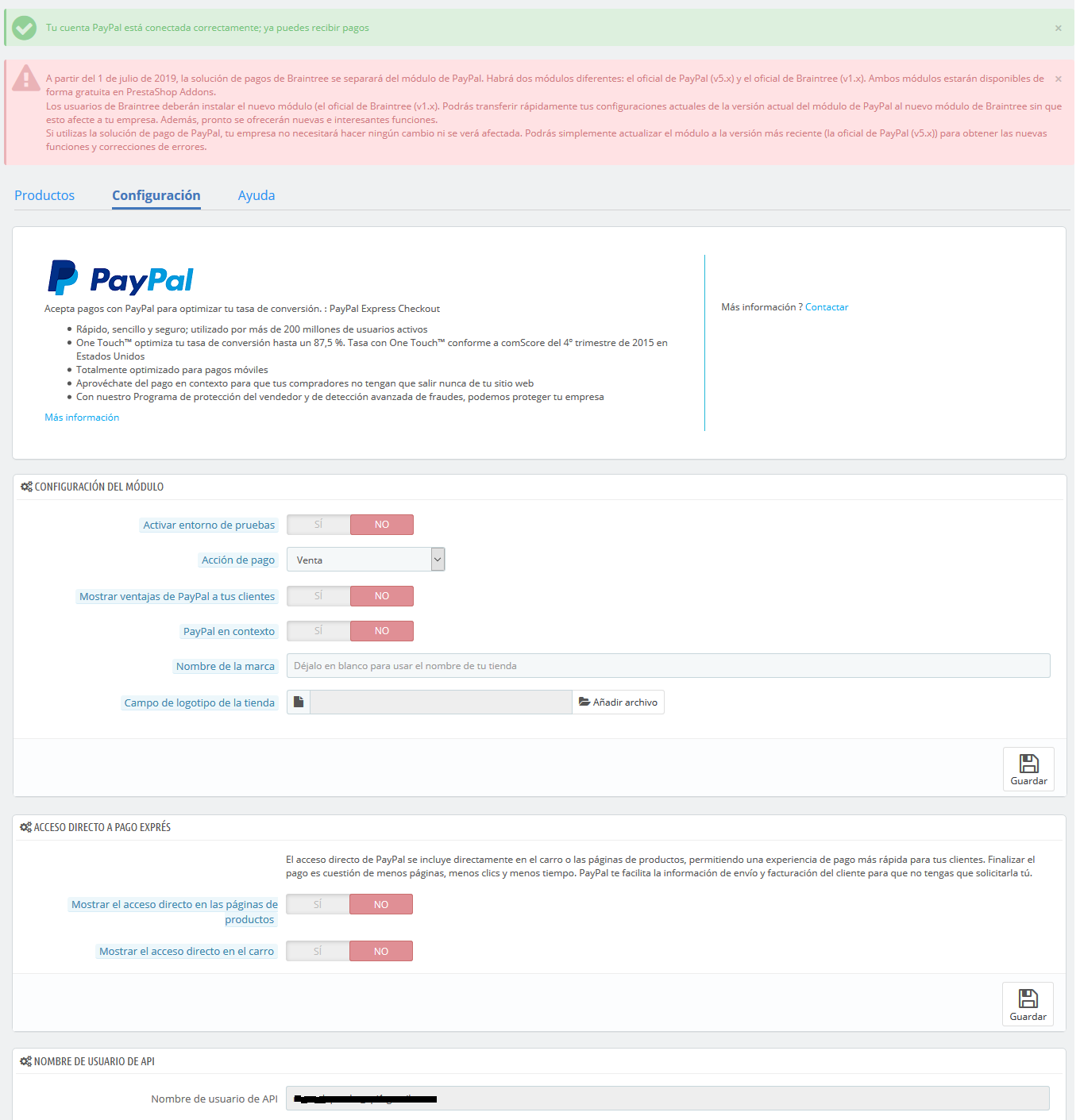 Javierlpz Posted August 2, 2019 Share Posted August 2, 2019 (edited) Hola, Si acabas de instalar el módulo debes tener una cuenta Paypal de empresa creada en la página oficial de Paypal. Ahí te darán el código o cadena secreta para insertar en la casilla "Nombre de usuario de API". Enlace Una vez en la cuenta de empresa de Paypal, vas en la parte superior a Herramientas/Configuración de la cuenta. Seleccionas la opción incluir botón paypal, después a "Añadir Paypal como otra forma de recibir pagos" / "Opción B" / "Configurar el acceso API cuando esté listo para pasar a producción". Después bajamos hasta "Integración de las API clásicas"/ "Administrar credenciales". En el módulo Paypal y Braintree gratuito que tienes instalado, en configuración (desde tu backoffice), abajo del todo es donde deberás introducir la cadena (secreta) que te darán en esta última pantalla: Cuando introduzcas la cadena, si no hay ningún otro problema debería, quedar así: Muchas de esas opciones que tienes activadas (y yo desactivadas) es porque el módulo está diseñado para "obligar" o "confundir" al cliente a que termine comprando mediante Paypal, como si fuese la única opción de pago en tu web (trabajo de marketing online), sin ni siquiera llegar a la zona de métodos de pago donde el cliente pueda elegir qué método de pago quiere en el caso de que ofrezcas más métodos de pago. También mete a calzador una imagen en la zona de pago, cuando el resto de métodos te saldrán solo con texto (más márketing online). Si quieres eliminar la imagen, para que quede con texto al igual que el resto de métodos de pago, entra por ftp a tu web y dirígete a la carpeta /web/modules/paypal/views/img y añade delante, por ejemplo un guión bajo a la imagen "paypal_sm.png" para que quede "_paypal_sm.png". Con esto deja de ser visible el logo de paypal en la sección de métodos de pago. Un saludo. Edited August 2, 2019 by Javierlpz (see edit history) Link to comment Share on other sites More sharing options...