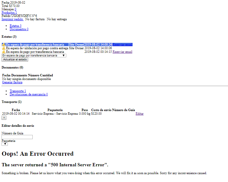 mmarquez04 Posted August 2, 2019 Share Posted August 2, 2019 Buenas tardes! ojala me puedan apoyar con el siguiente error.. en la parte admin de prestashop en la opcion "pedidos" al momento de darle click en la parte de vista. me genera el error 500 . Adjunto Imgenes de la tabla pedidos, asi como el error que me genera y la imagen de la depuracion al ejecutar la vista del pedido. Utilizo prestashop 1.7.6 Saludos! Link to comment Share on other sites More sharing options...