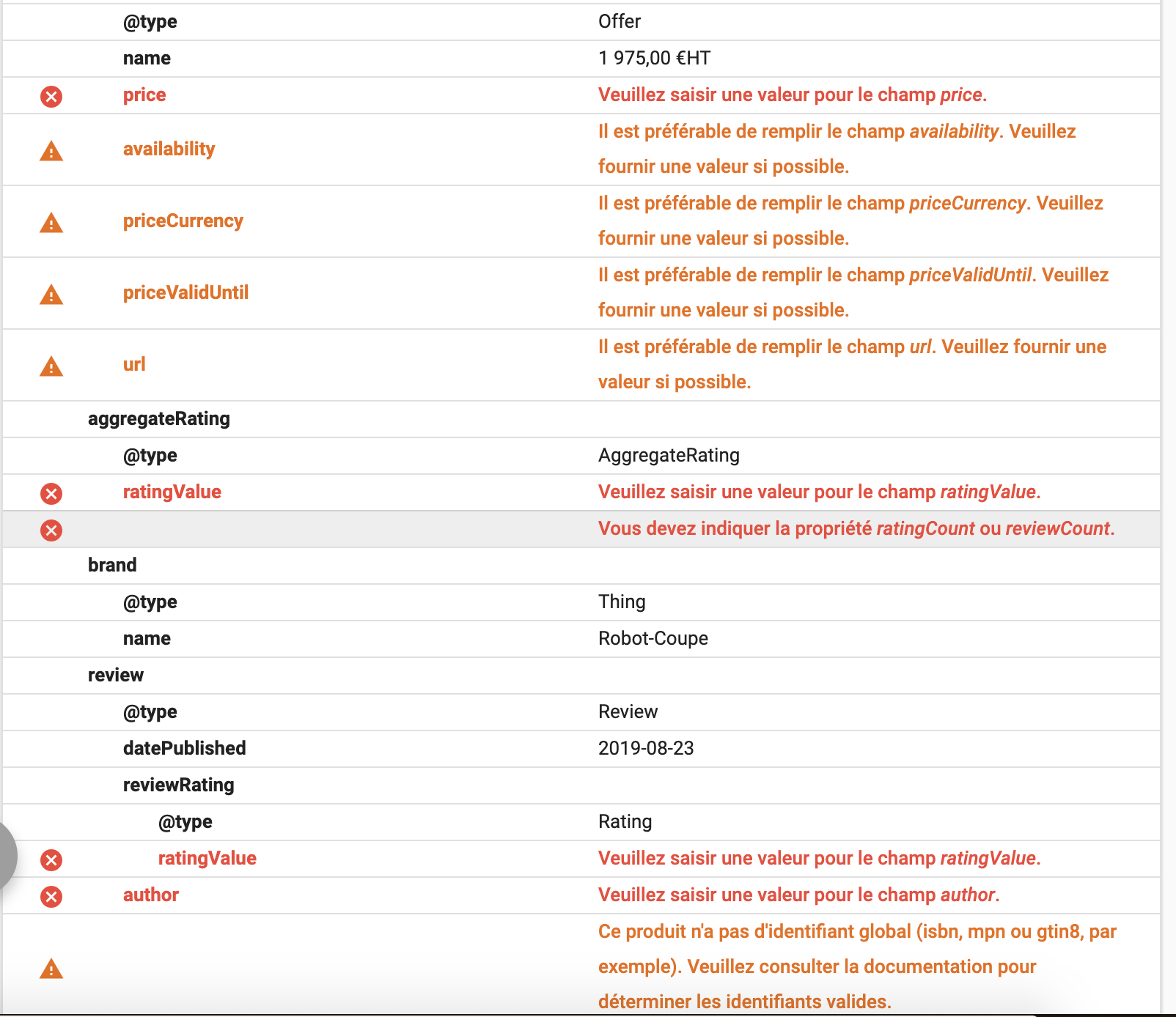 @rthur Posted August 23, 2019 Share Posted August 23, 2019 Bonjour, Je suis sous prestashop 1.7.5. J'ai trouvé un tuto pour ajouter ce code dans ma page product-price.tpl. Seulement j'aimerais aussi ajouter le prix que google ne reconnais pas mais je ne sais pas comment l'insérer. <link itemprop="availability" href="{$product.seo_availability}"/> <meta itemprop="priceCurrency" content="{$currency.iso_code}"> <meta itemprop="priceValidUntil" content="{'Y'|date+1}-12-31"> <meta itemprop="url" content="{$link->getProductLink($smarty.get.id_product)|escape:'htmlall':'UTF-8'}"> <meta itemprop="brand" content="{if !empty(Manufacturer::getnamebyid($product.id_manufacturer))}{Manufacturer::getnamebyid($product.id_manufacturer)}{else}{Configuration::get('PS_SHOP_NAME')}{/if}"> <meta itemprop="image" content="{$product.cover.bySize.home_default.url}"> <meta itemprop="sku" content="{$product->id}" /> <meta itemprop="mpn" content="{$product->reference}" /> <div itemprop="review" itemscope itemtype="http://schema.org/Review" style="display:none"> <span itemprop="author">{Configuration::get('PS_SHOP_NAME')}</span>, <meta itemprop="datePublished" content="{'Y'|date}-{'m'|date}-{'d'|date}"> <div itemprop="reviewRating" itemscope itemtype="http://schema.org/Rating"> <meta itemprop="worstRating" content="1"/> <span itemprop="ratingValue">5</span>/ <span itemprop="bestRating">5</span> </div> <span itemprop="description"></span> </div> Auriez-vous une idée? Merci Link to comment Share on other sites More sharing options...
